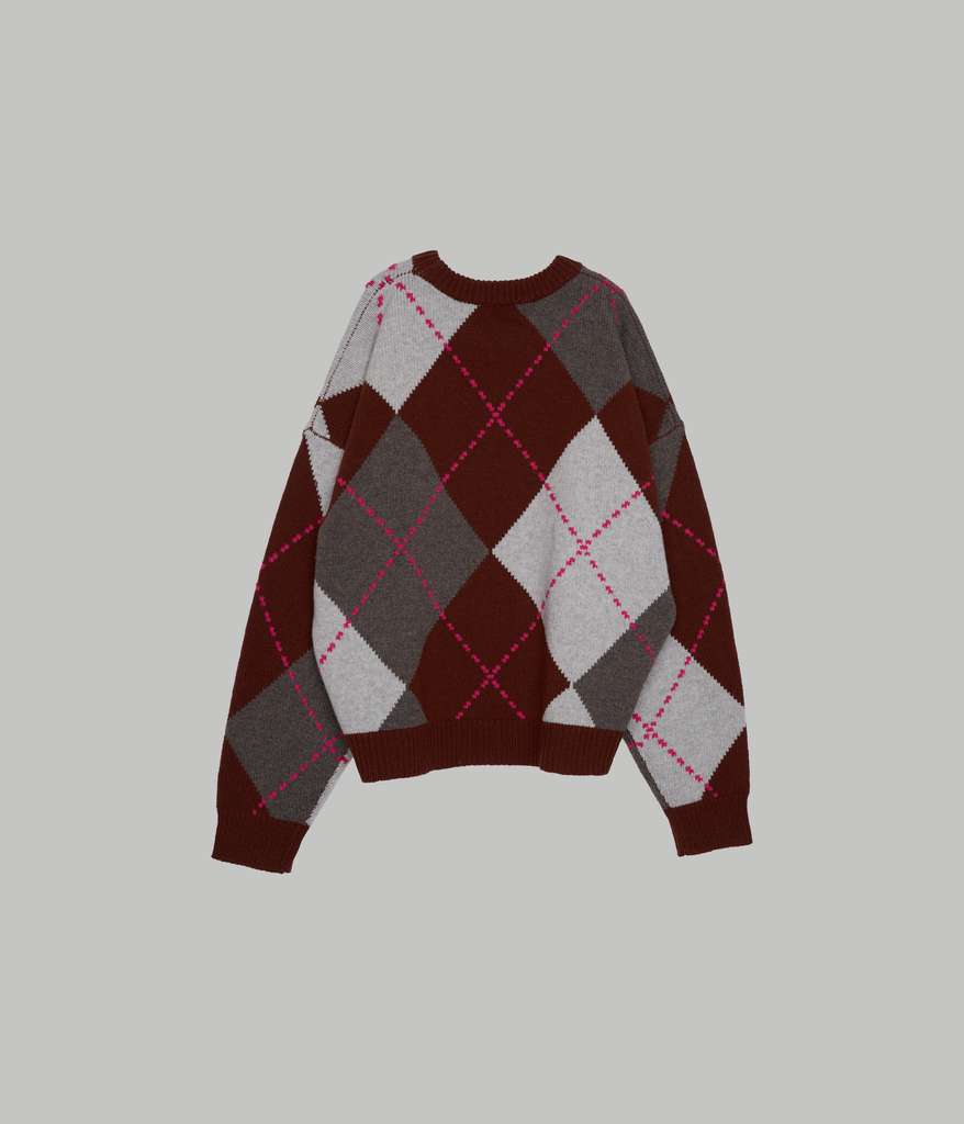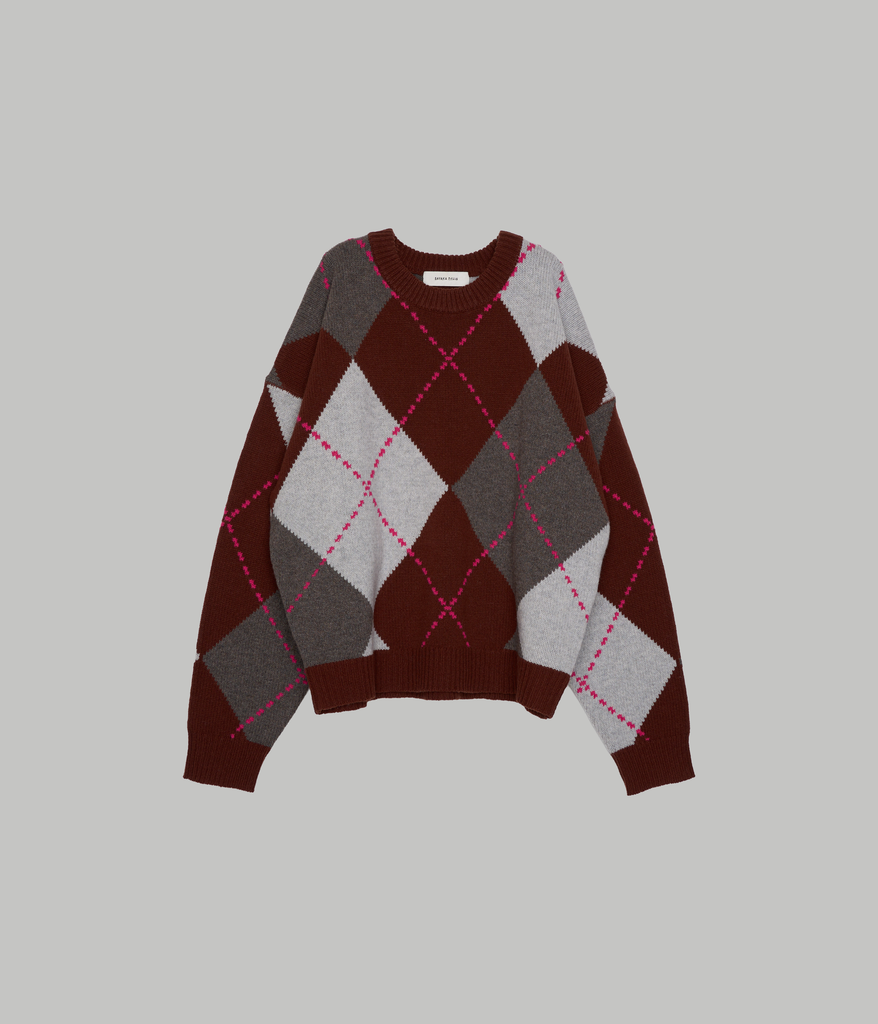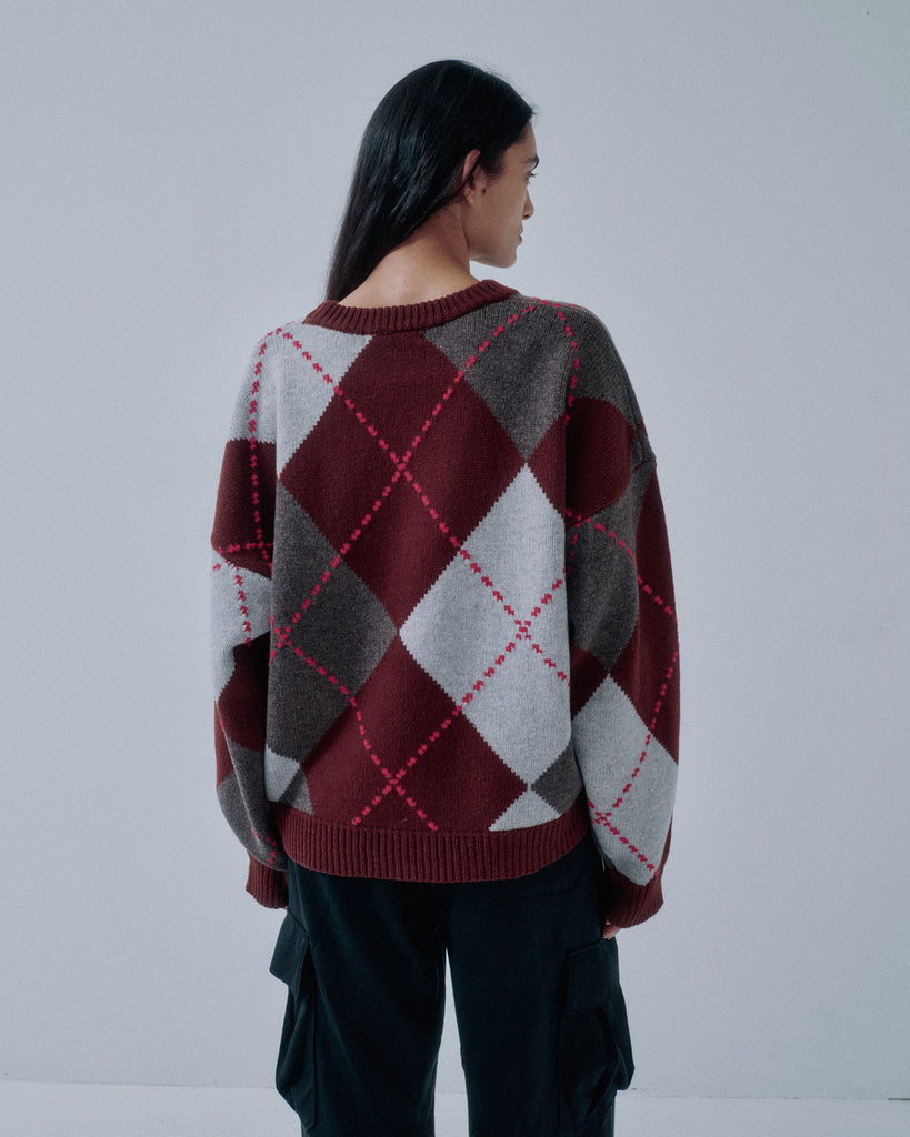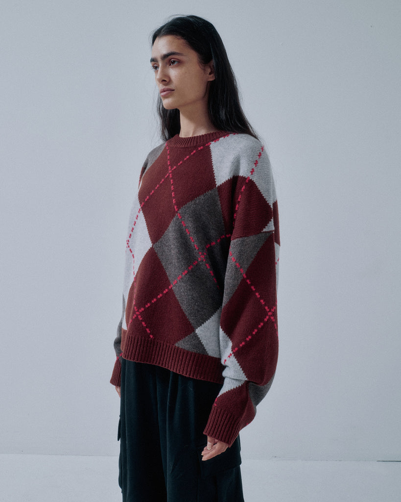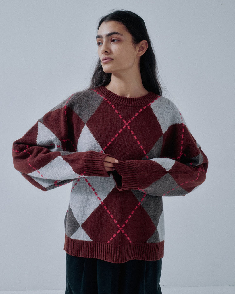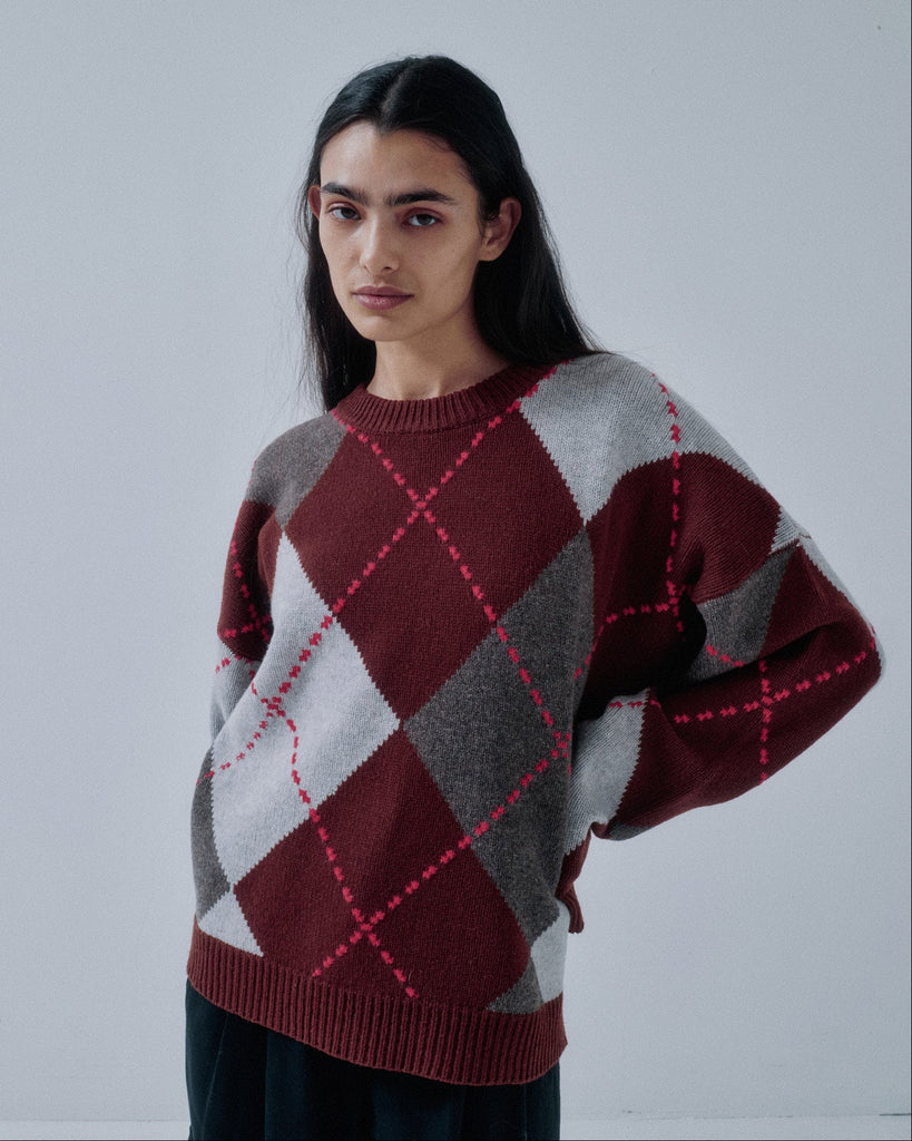 An oversized sweater knitted in an irregular argyle pattern. By introducing subtle unpredictability to the color placement, it adds a quiet sense of play to the otherwise classic motif. Pair it with denim, tailored trousers, or capri pants to move effortlessly between casual ease and a more classic, composed look.
