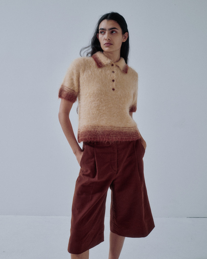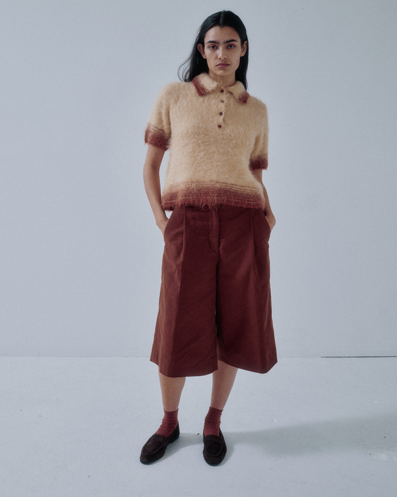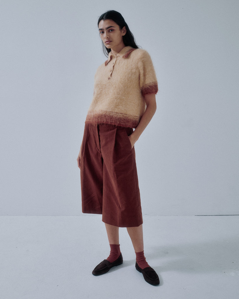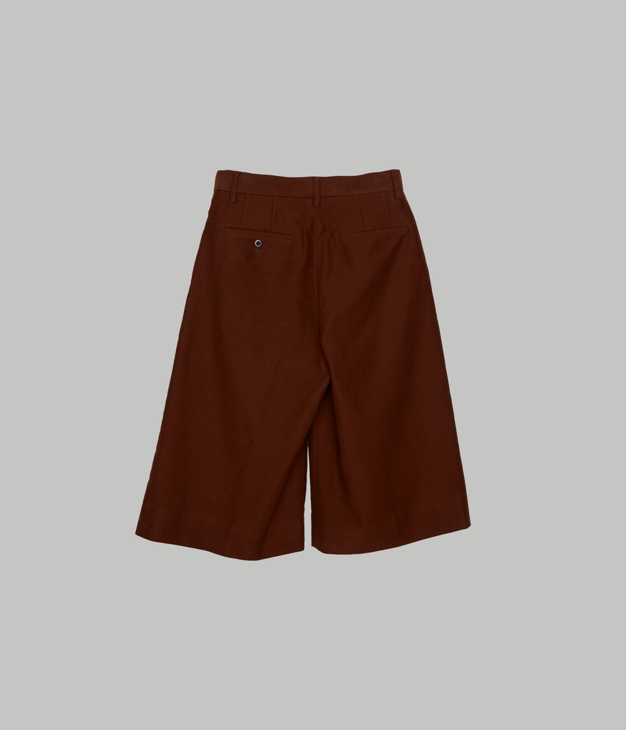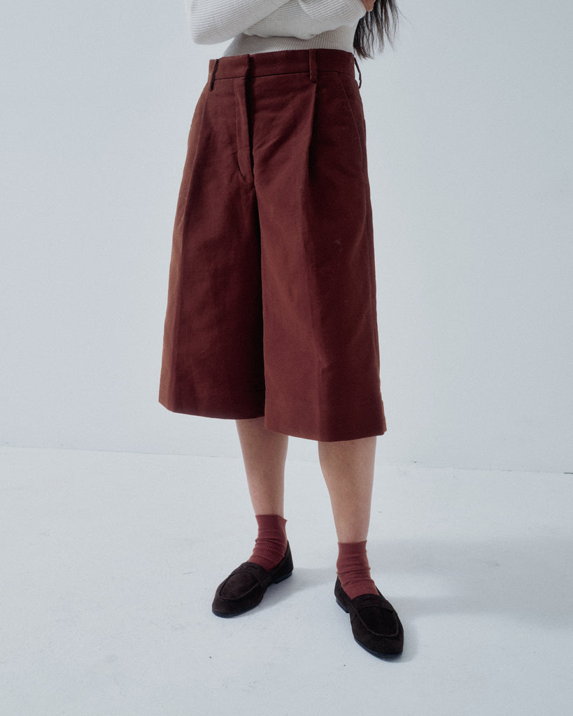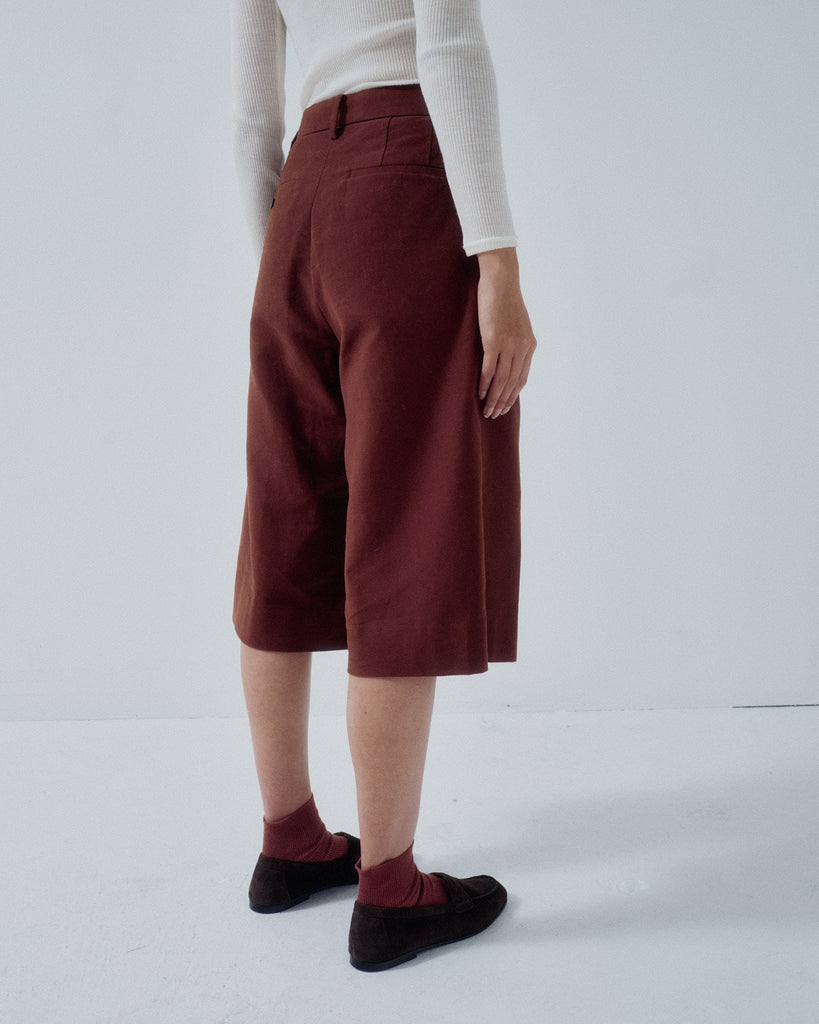 New capri pants in soft organic cotton moleskin. Featuring generous tucks and a waistband finished with a traditional waistband curtain, giving them the character of classic men’s trousers. The slightly longer below-the-knee length pairs beautifully with long boots, or with socks and loafers for a balanced, modern look.