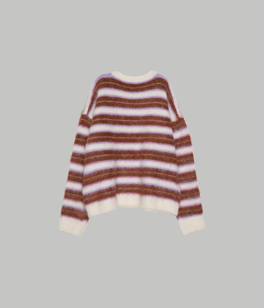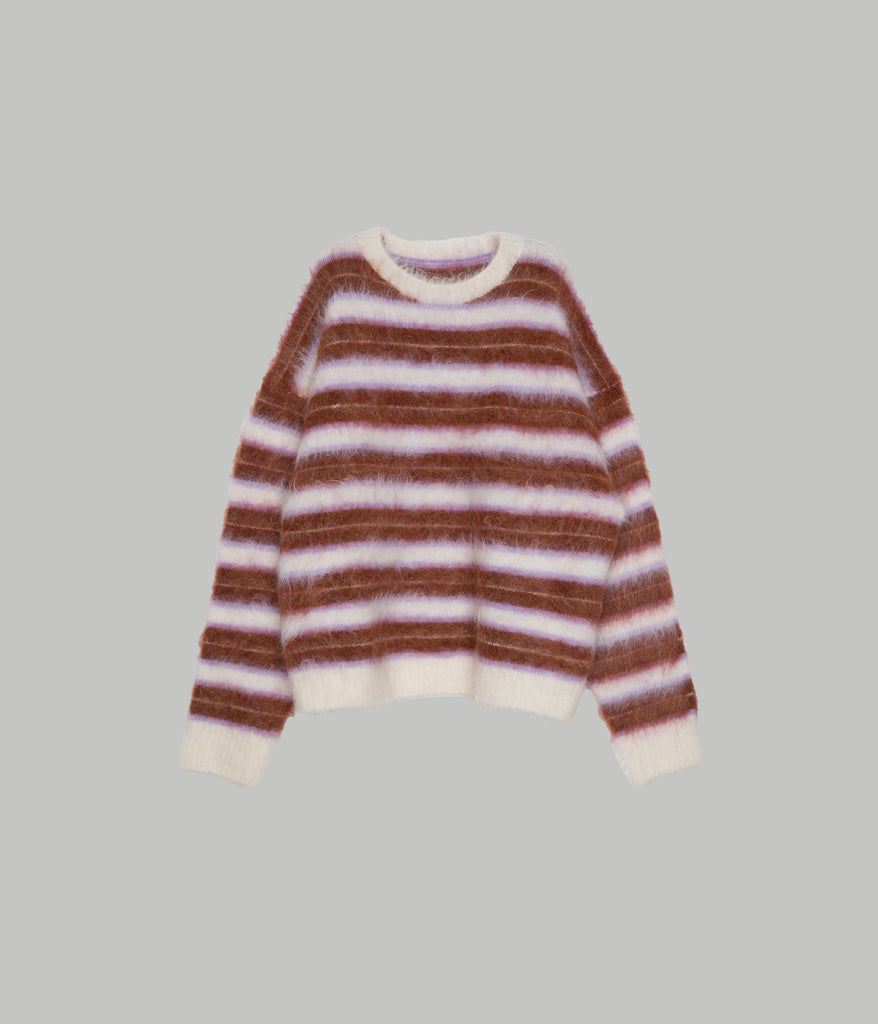 A striped sweater crafted from airy, hair-textured alpaca yarn. Brushed to enhance its soft halo, the finish gently blurs the borders of the stripes; resulting in a look that feels softer and more wearable than its graphic impression suggests.