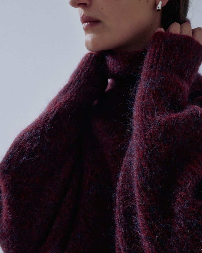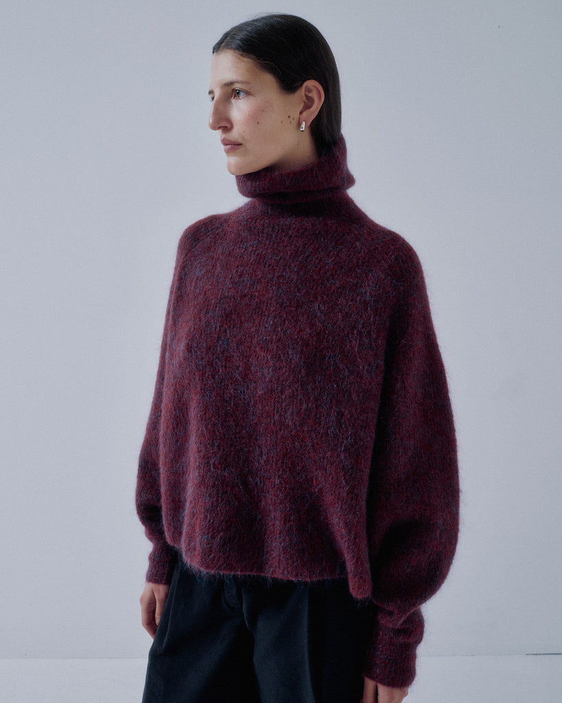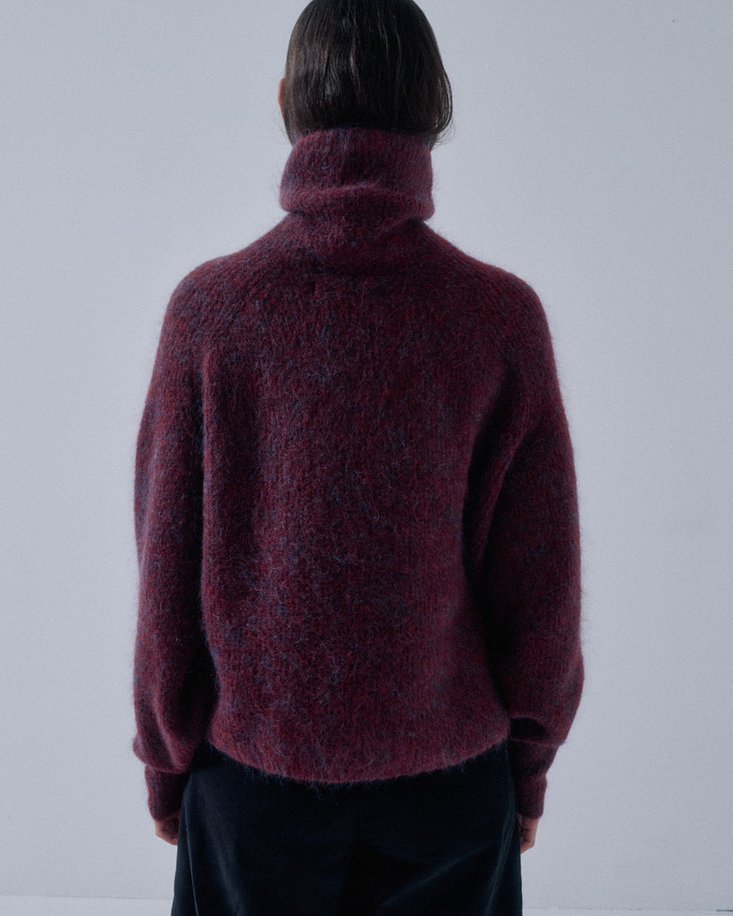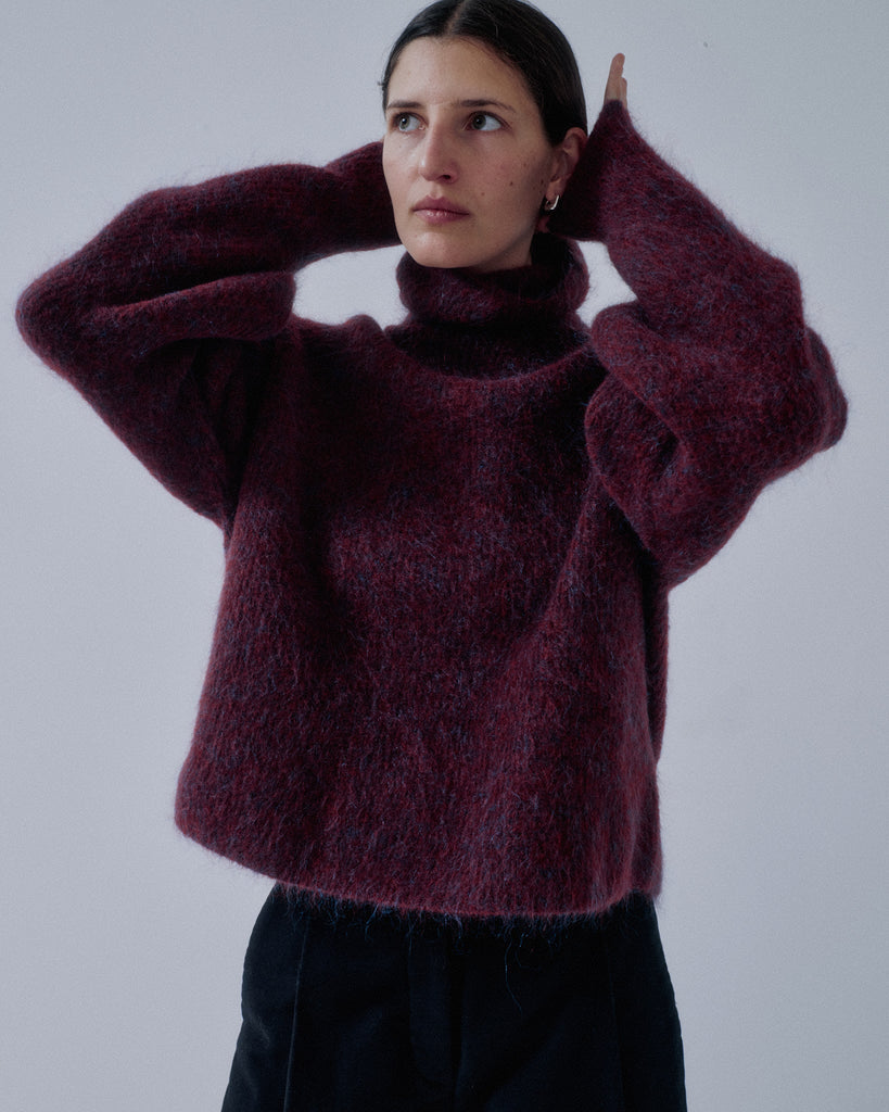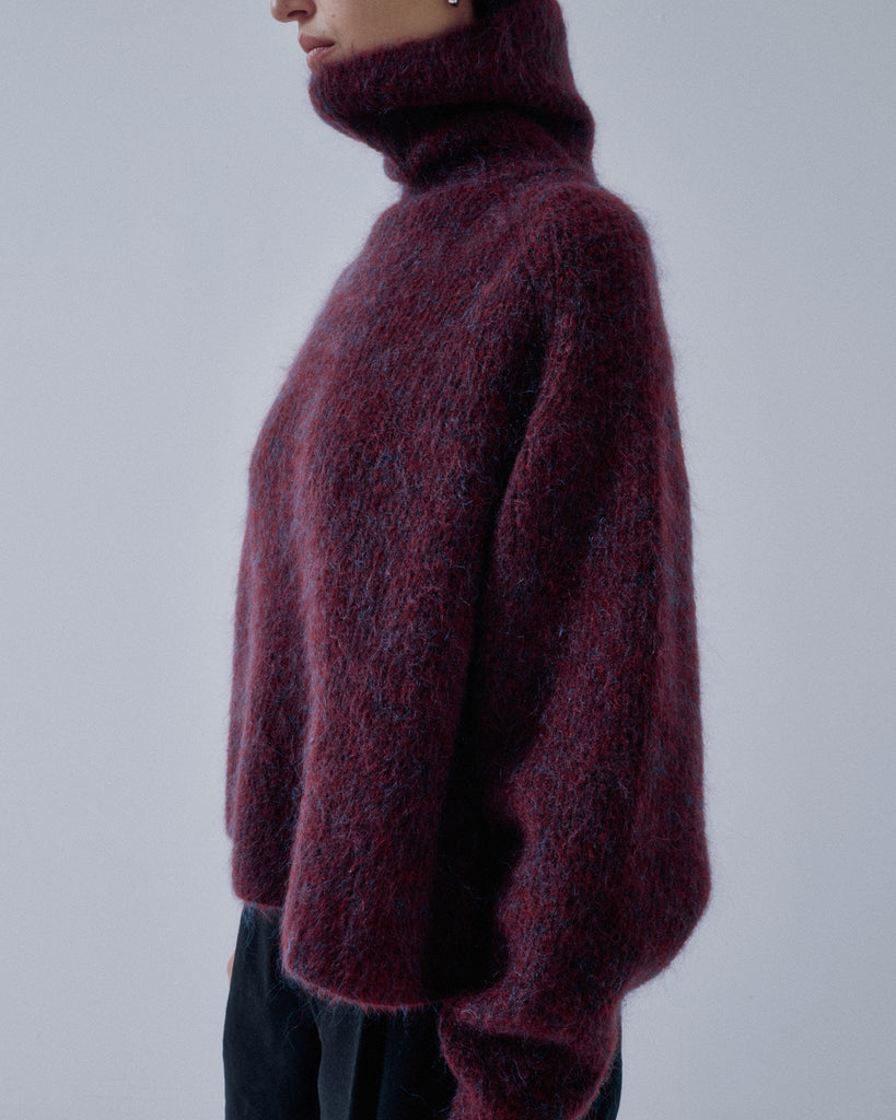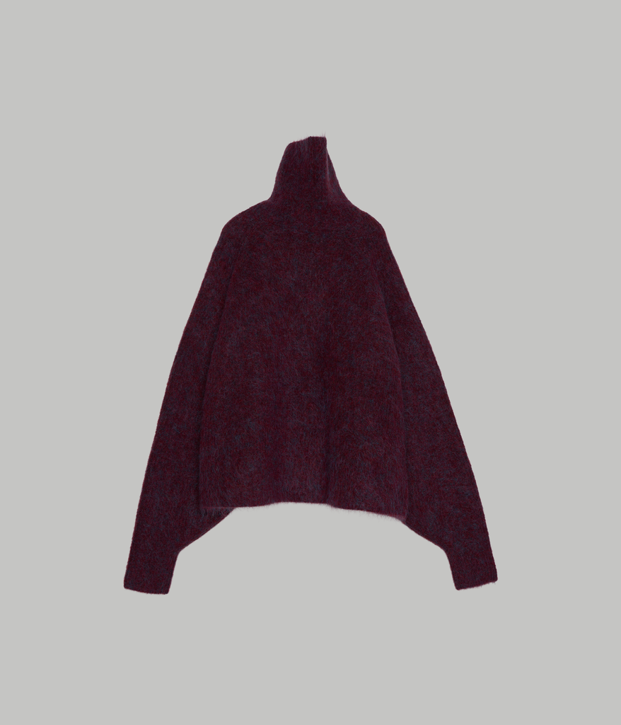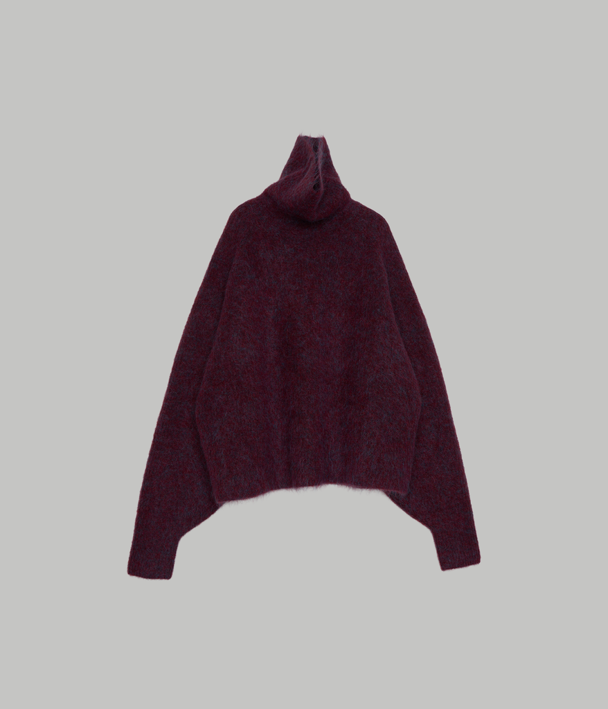 The signature high-neck from SAYAKA DAVIS’s mohair series. Featuring sculpted, curved sleeves and a generous collar as standout details. The absence of a seam at the front makes it easy to wear and reduces any tightness around the neck. The collar can be folded over or left standing, creating a balanced and versatile look. This season, the length has been shortened to provide a more modern and versatile fit, making it easier to pair with this season's bottoms.