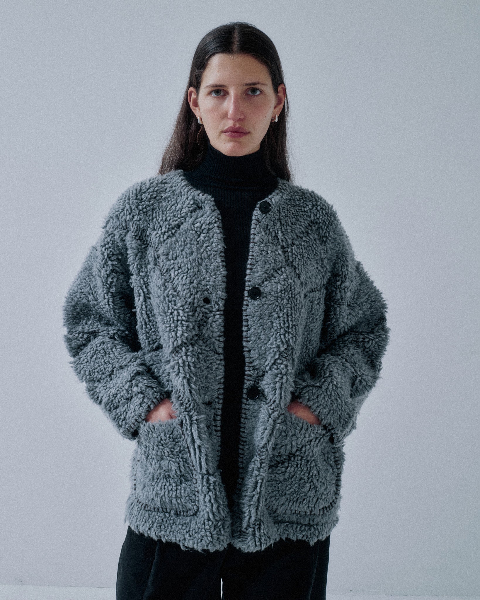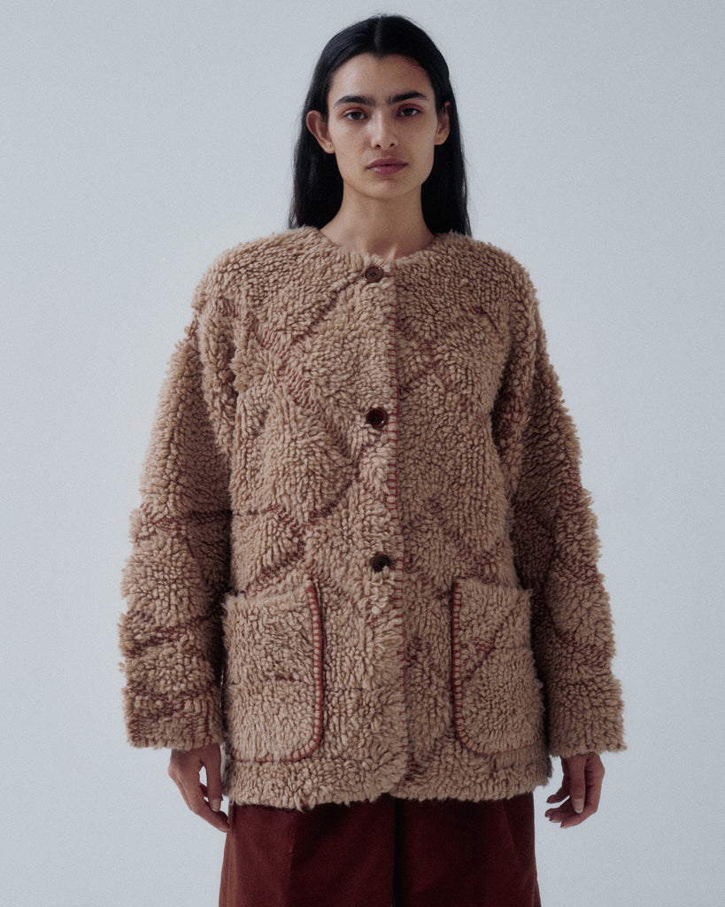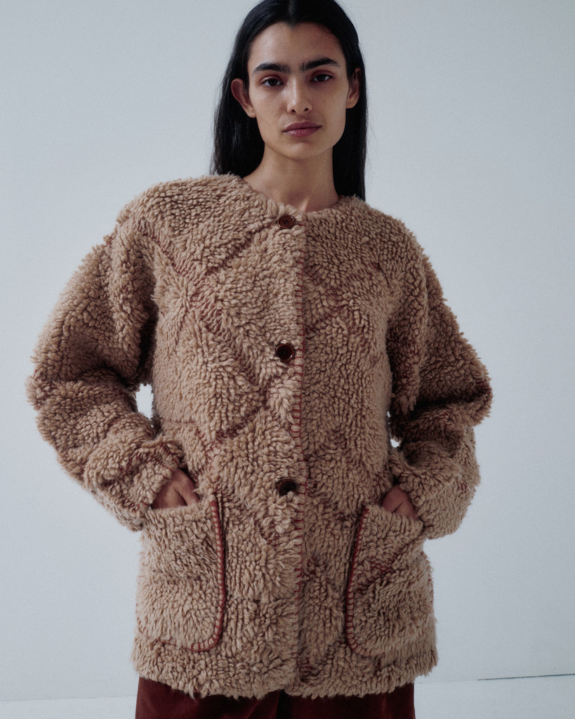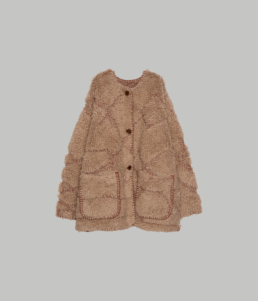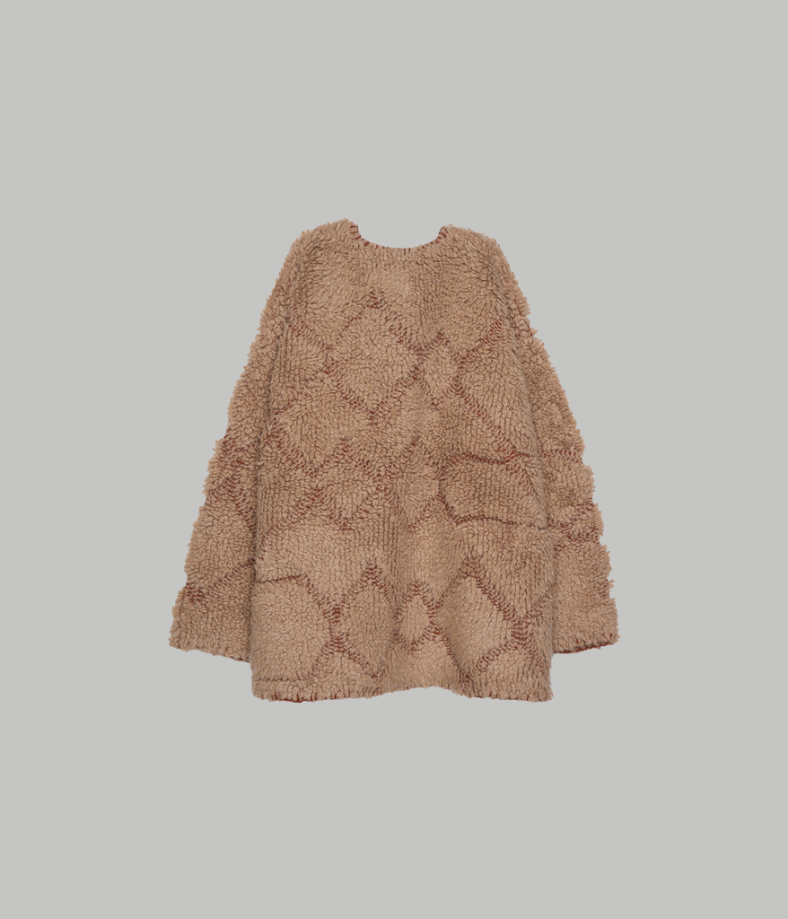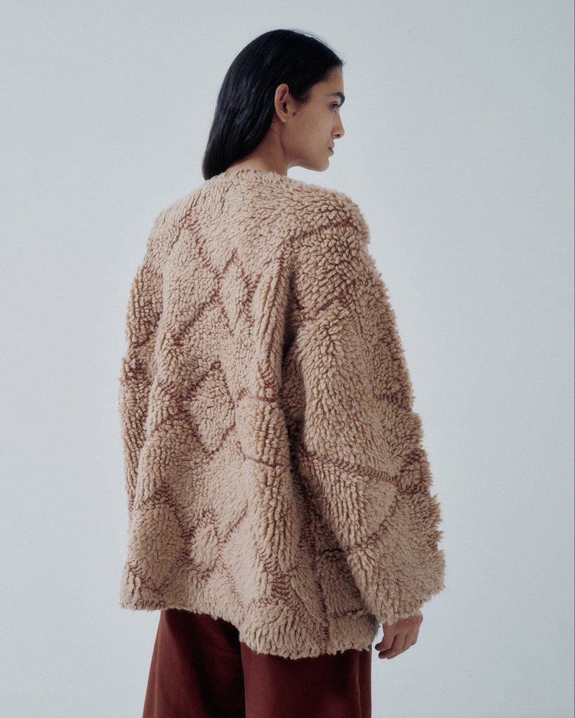 A pile-knit jacket featuring a two-tone Moroccan bebi-inspired jacquard pattern. The edges are finished with color-contrast hand blanket stitching, adding a subtle accent. This outerwear serves as a stylish statement piece, perfect for pairing with denim or skirts.