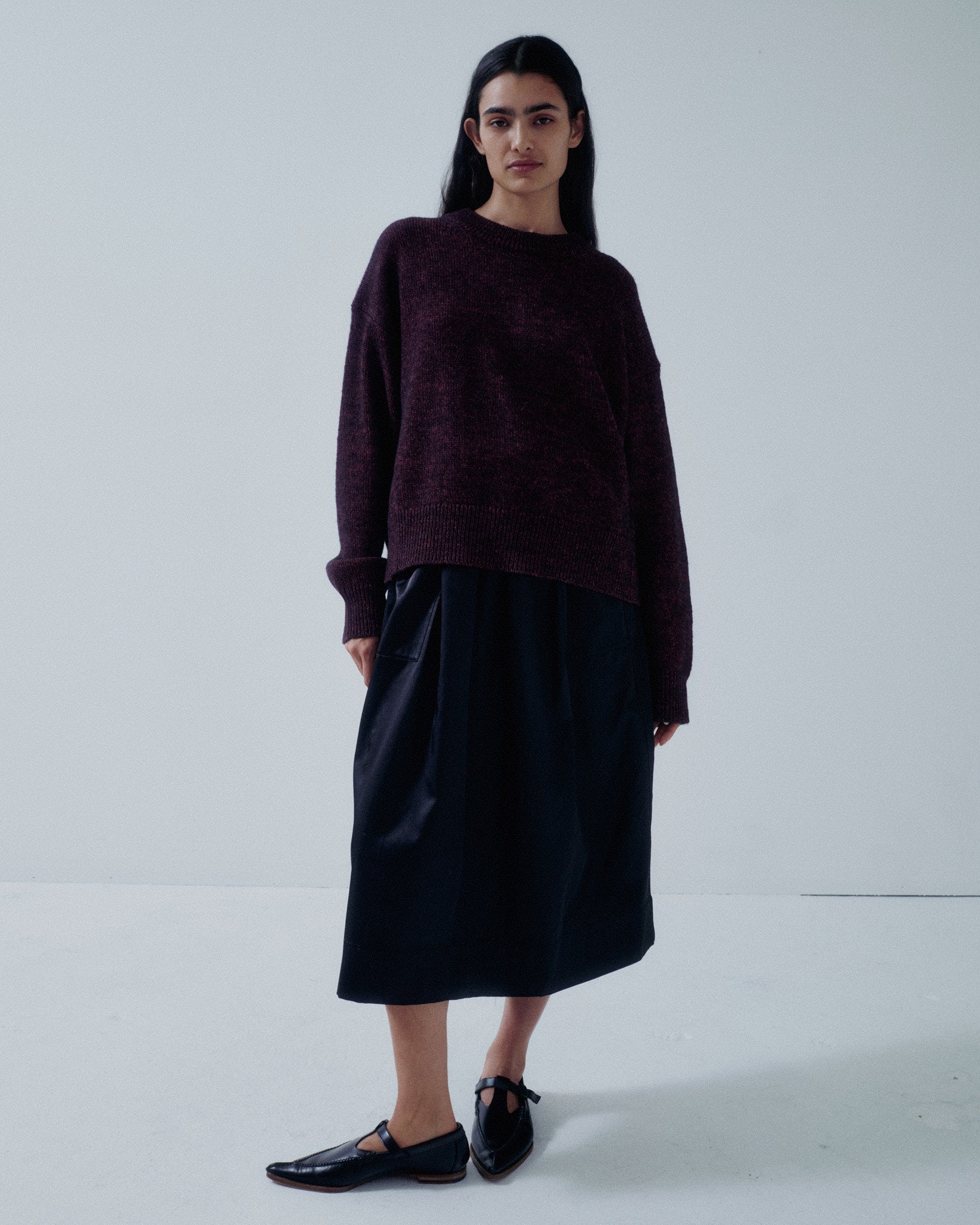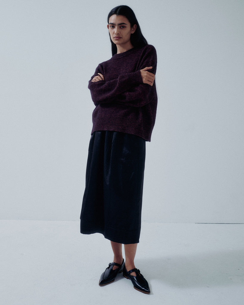 Elastic-waist midi skirt. Proposed as an alternative to leather, this material features a refined subtle sheen and a smooth texture with balanced weight and structure. The semi-flared silhouette is accented with front patch pockets. Versatile in styling, it transitions effortlessly from a relaxed look paired with an oversized sweater to a chic ensemble styled with a satin blouse, making it suitable for a wide range of occasions.