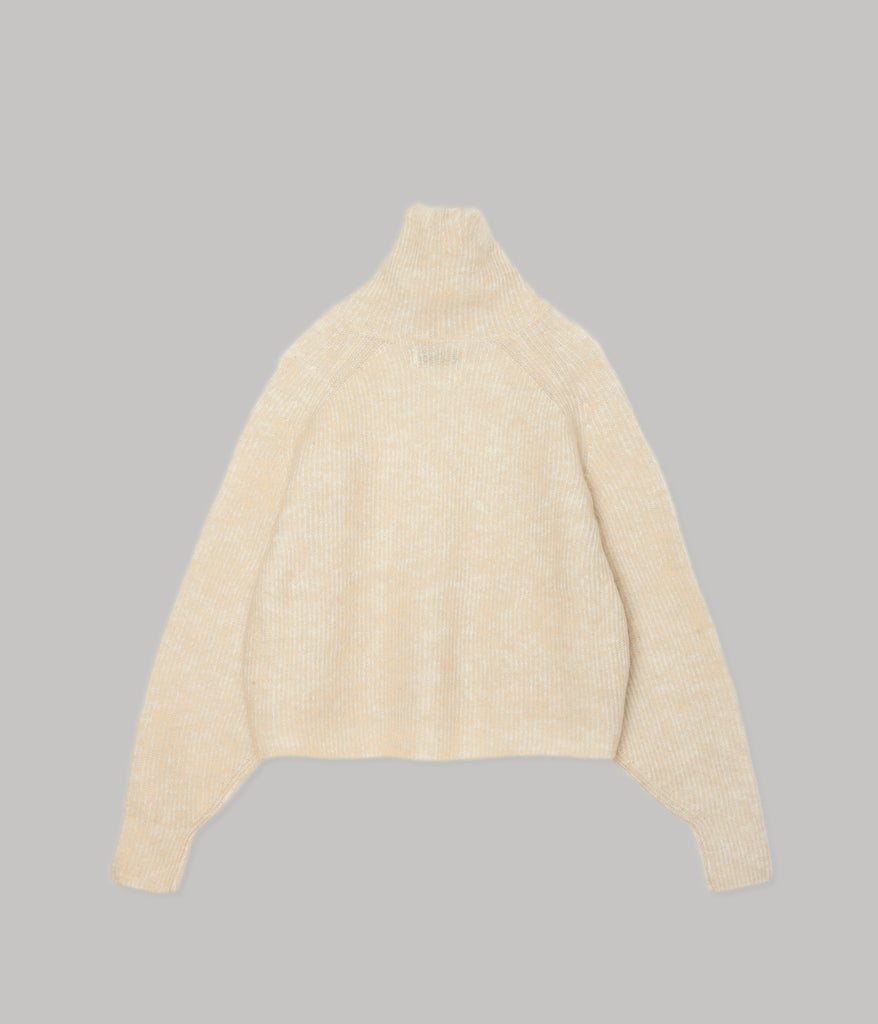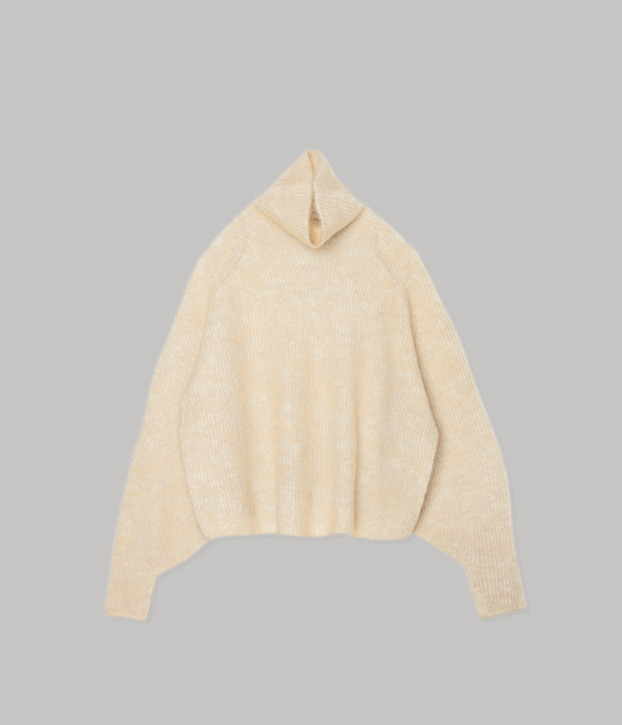 The signature high-neck from SAYAKA DAVIS’s mohair series. Featuring sculpted, curved sleeves and a generous collar as standout details. The absence of a seam at the front makes it easy to wear and reduces any tightness around the neck. The collar can be folded over or left standing, creating a balanced and versatile look. This season, the length has been shortened to provide a more modern and versatile fit, making it easier to pair with this season's bottoms.