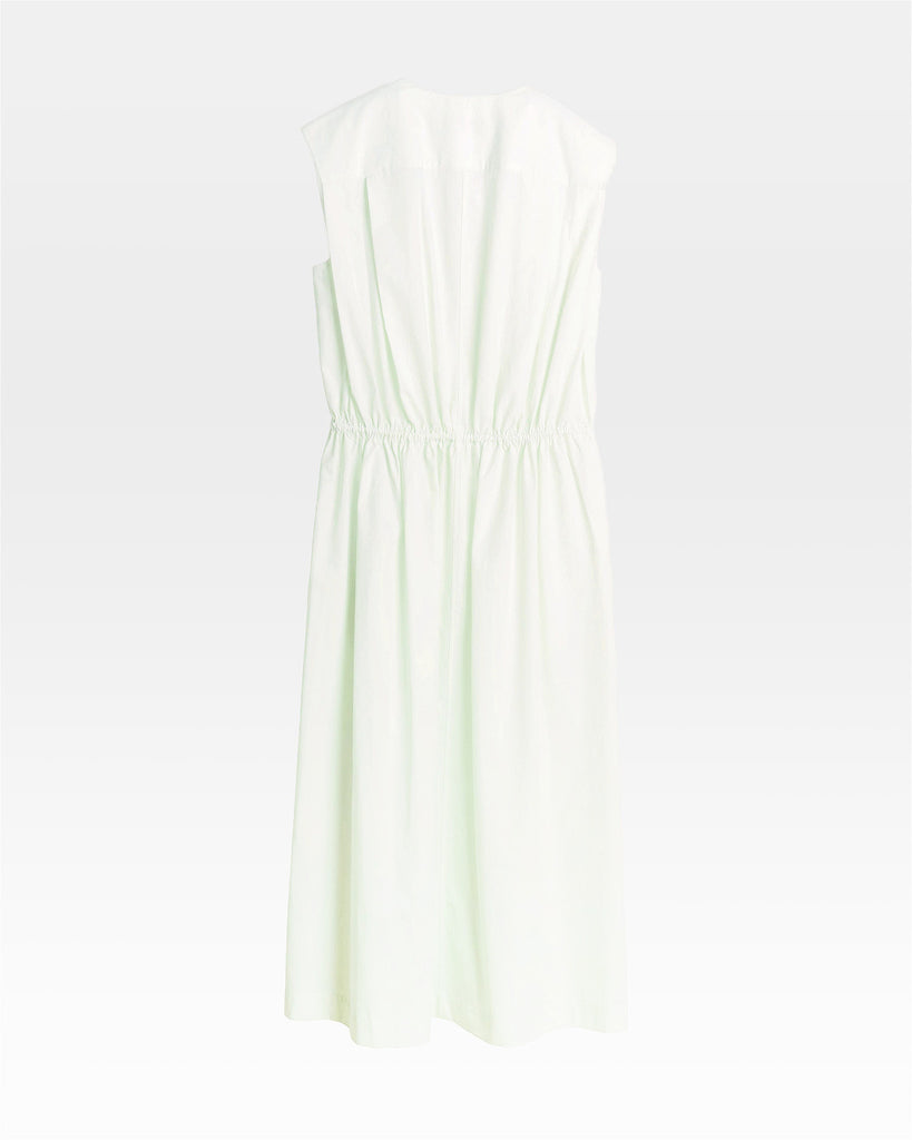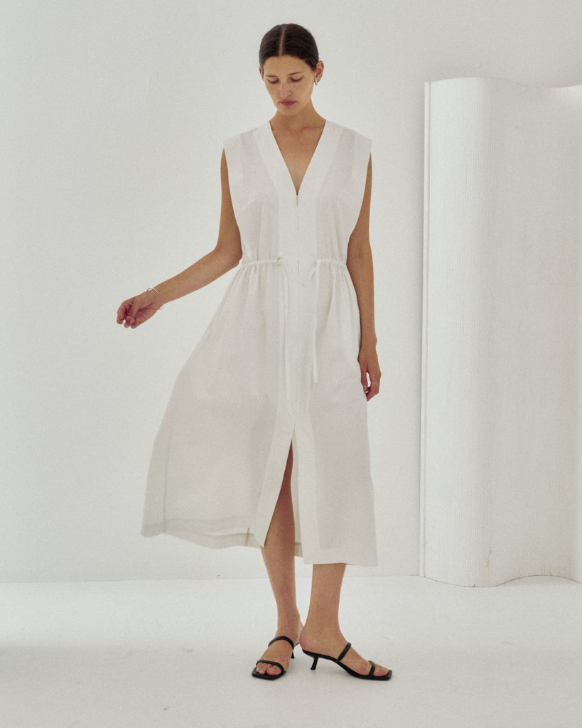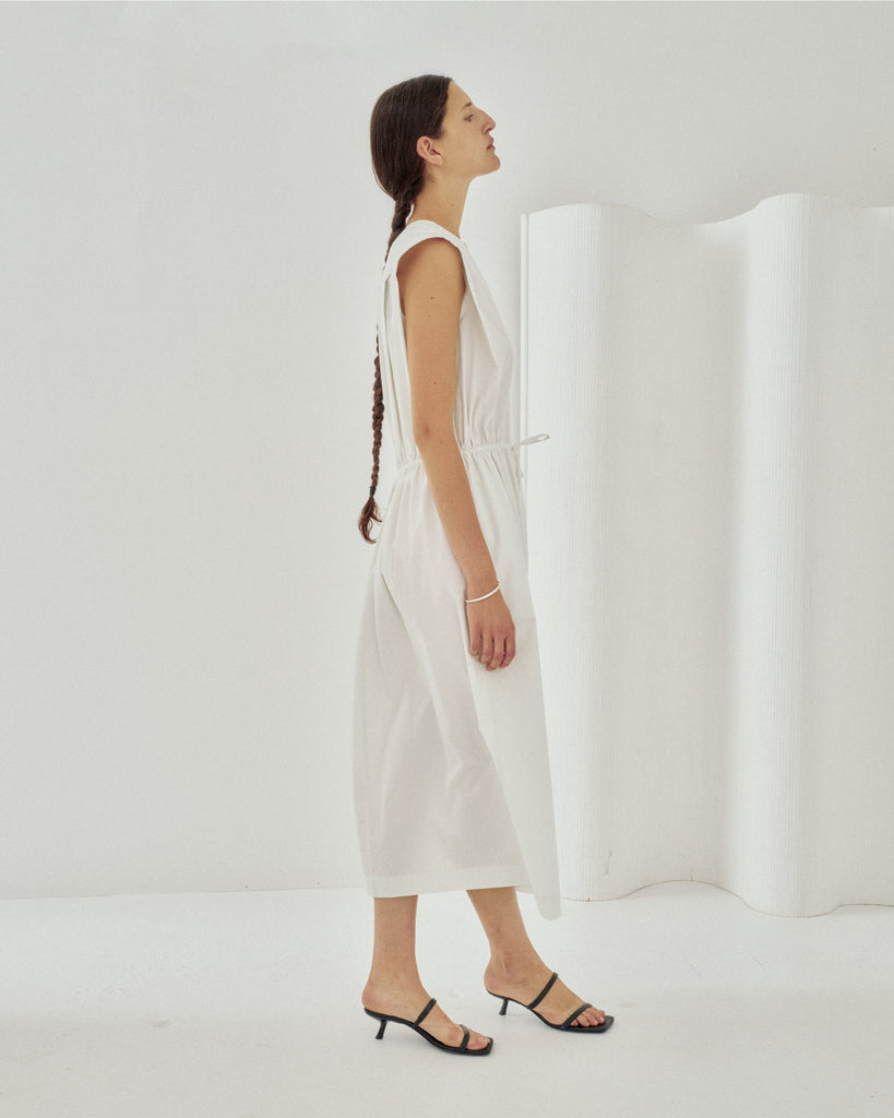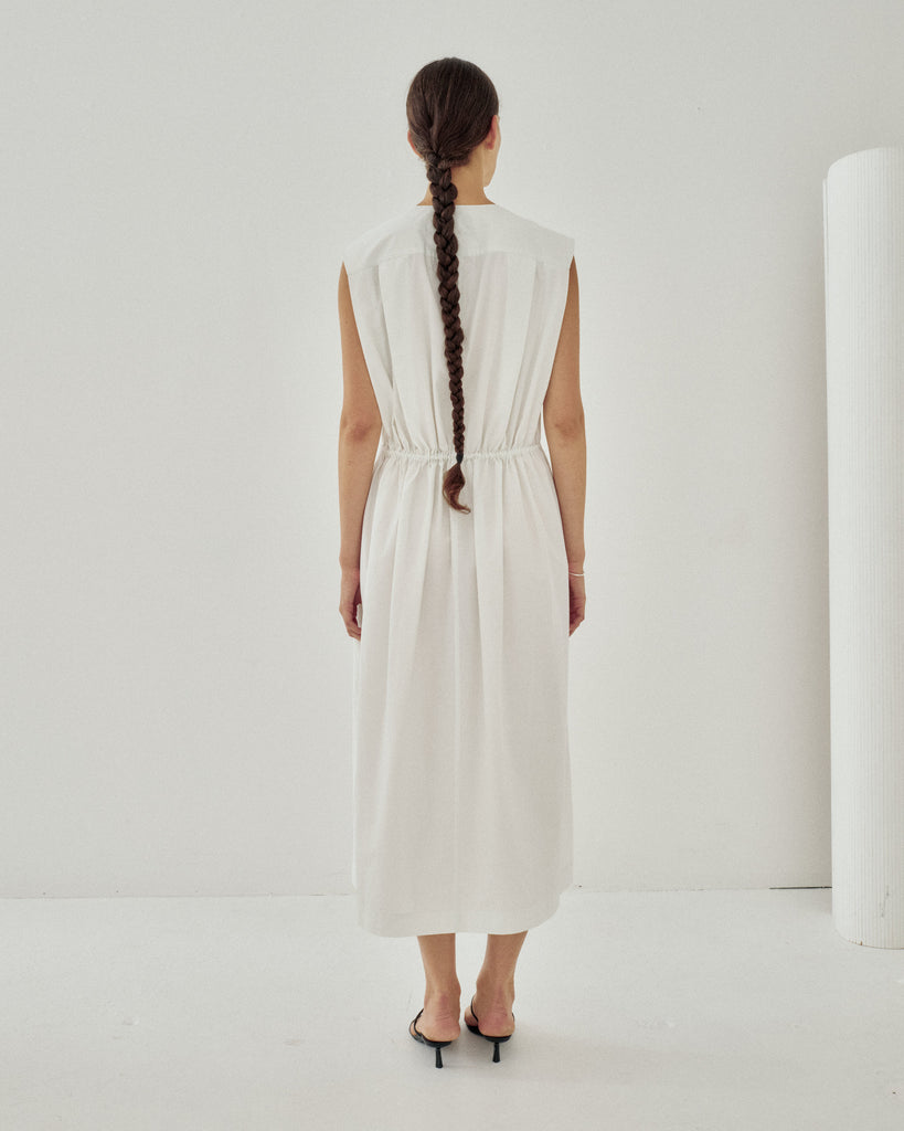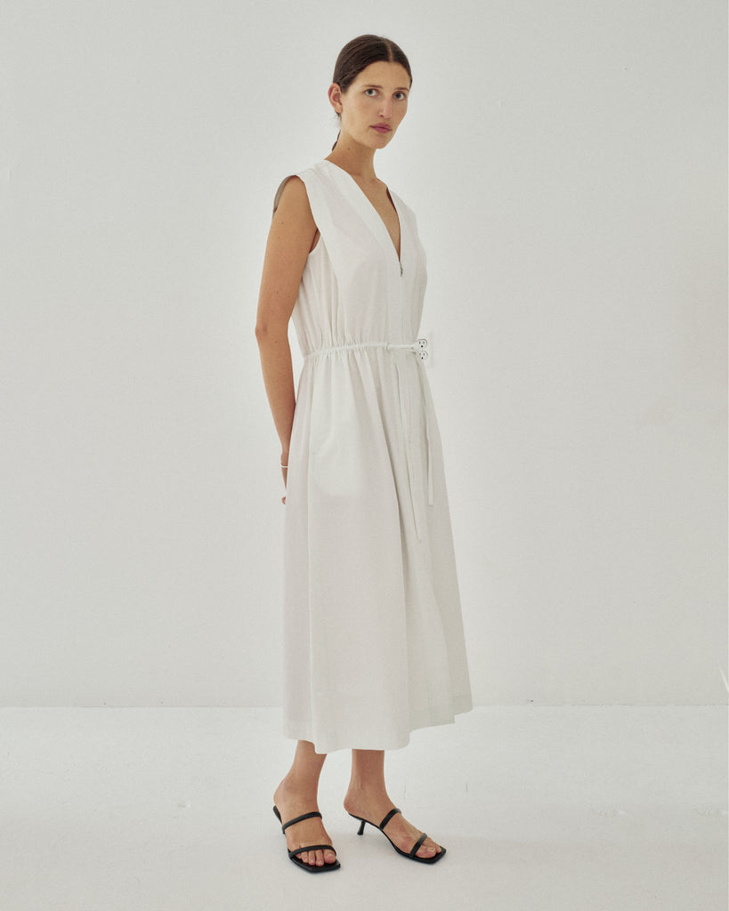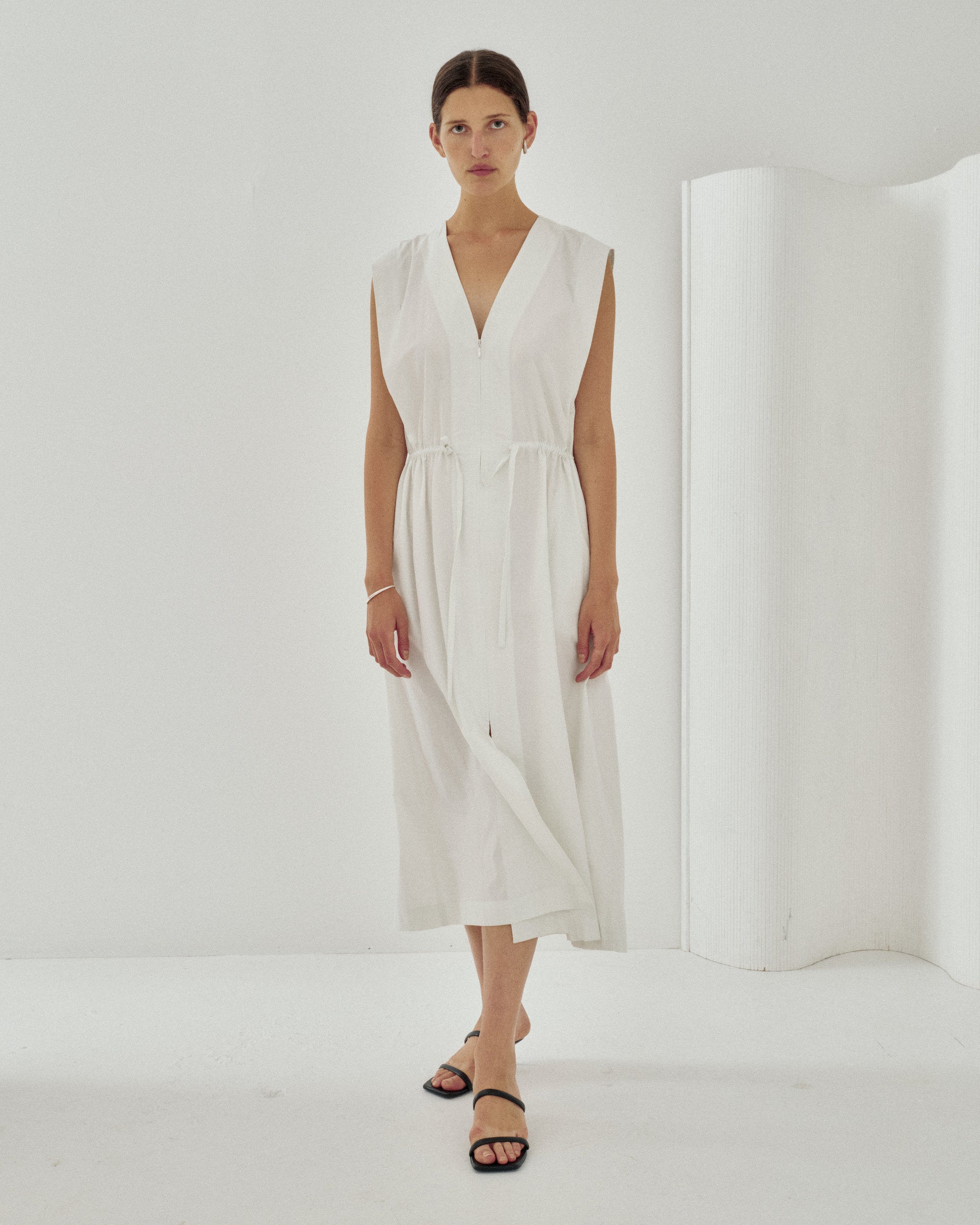 Waist-gathered dress accented with a front zipper. Generous tucks at the sides and back create soft draping, while the adjustable drawstring waist allows the silhouette to shift with ease. The deep V-neck is ideal for layering, making it versatile across seasons and occasions depending on the choice of innerwear. A piece that balances femininity with lightness.