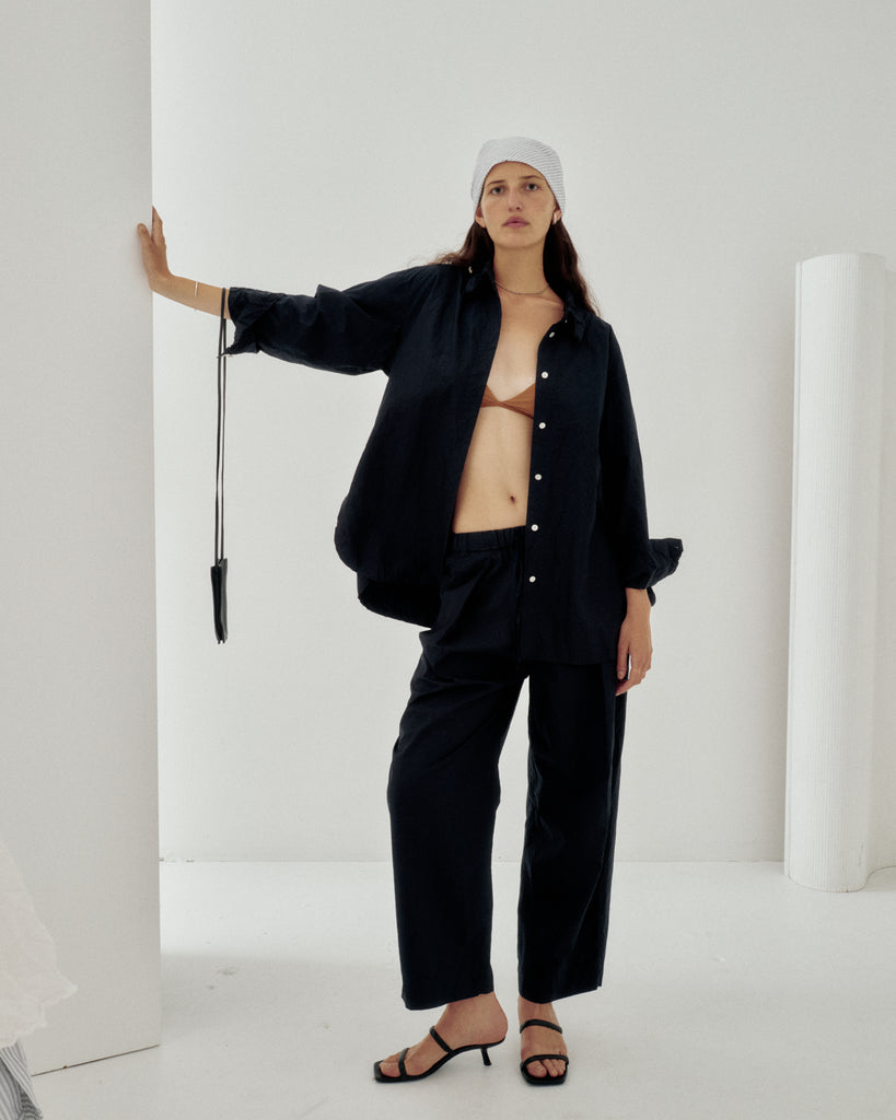 SD oversized shirt with a relaxed fit, wide sleeves, and deep side slits. The catch-washer finish adds a naturally crinkled, airy texture, as if gently worn in. Made from premium organic cotton that blends softness with subtle crispness, it needs no ironing after washing. Versatile enough to wear as a shirt or a light outer layer, it’s a timeless SAYAKA DAVIS Evergreen piece for every season.