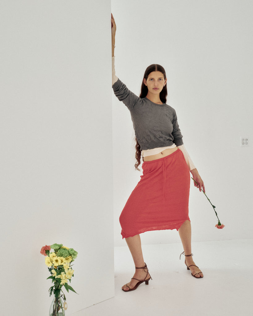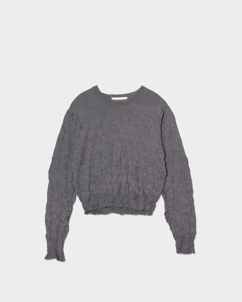 Introducing the new SAYAKA DAVIS crinkled knit pullover. Featuring a cropped length and compact fit, this pullover showcases a random crinkled texture that imparts a fresh and distinctive look. Its versatility allows it to pair seamlessly with various materials, from acetate satin and elegant suiting to casual denim, adding a minimal yet refined accent to your ensemble.
