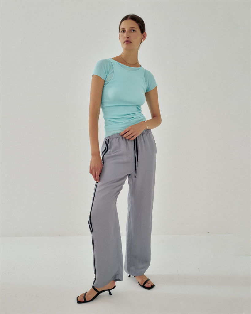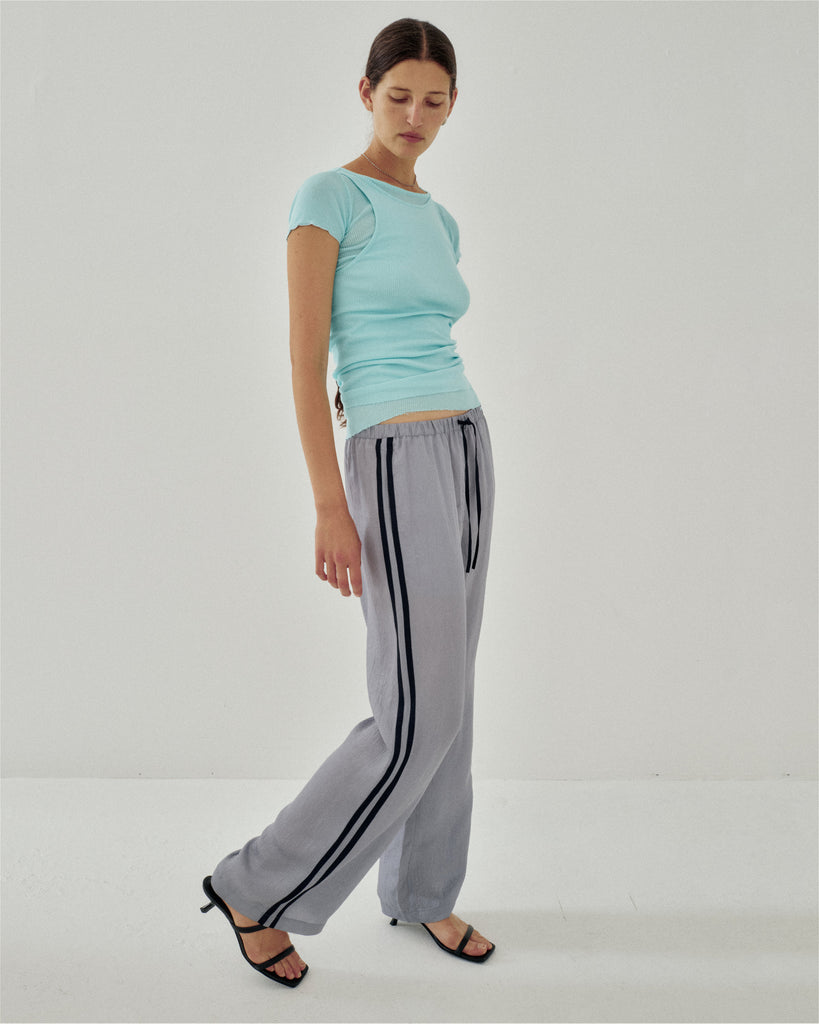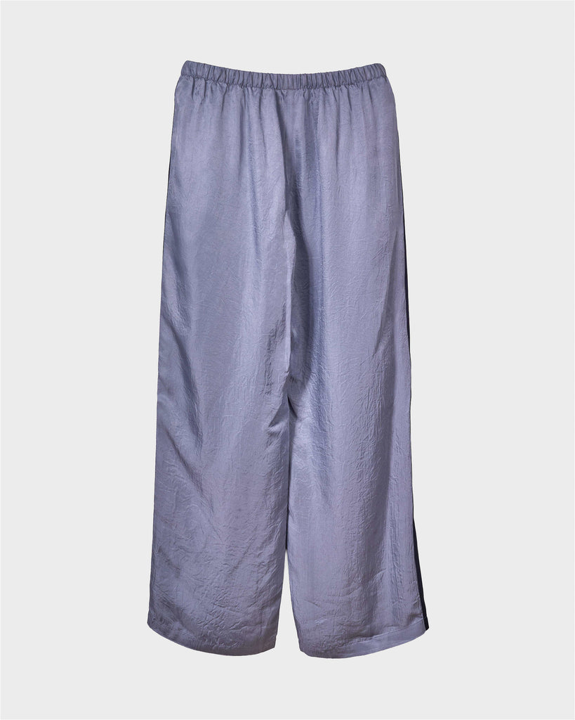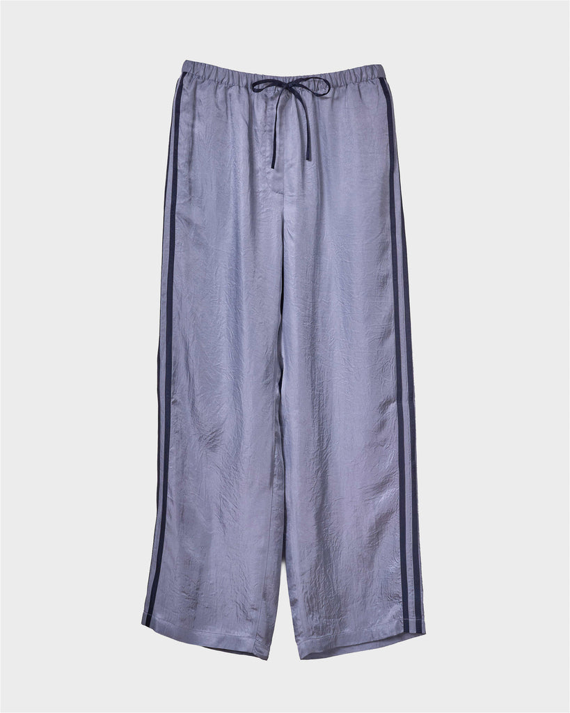 Track pants inspired by sportswear. The lightweight, vintage-like acetate with a soft sheen is accented with contrast side stripes for a sporty touch. They pair well with compact ribbed tops or oversized shirts, creating a relaxed yet refined casual style.