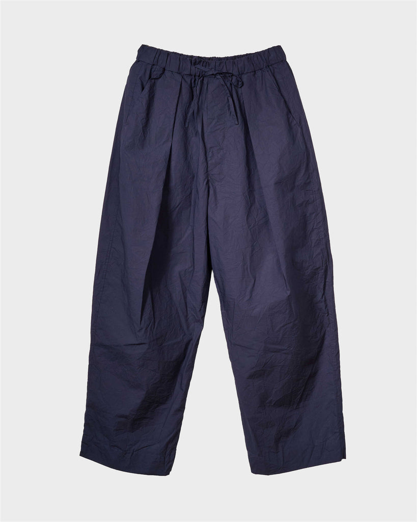 Relaxed-fit pants finished with a catch-washer process for a naturally crinkled texture. Deep tucks, faux-opening details, and wide hem cuffs add a modern touch to the easy silhouette. The elastic waistband ensures comfort, while premium organic cotton offers both softness and subtle structure, requiring no ironing after washing. A versatile piece designed to move seamlessly from everyday life to travel.