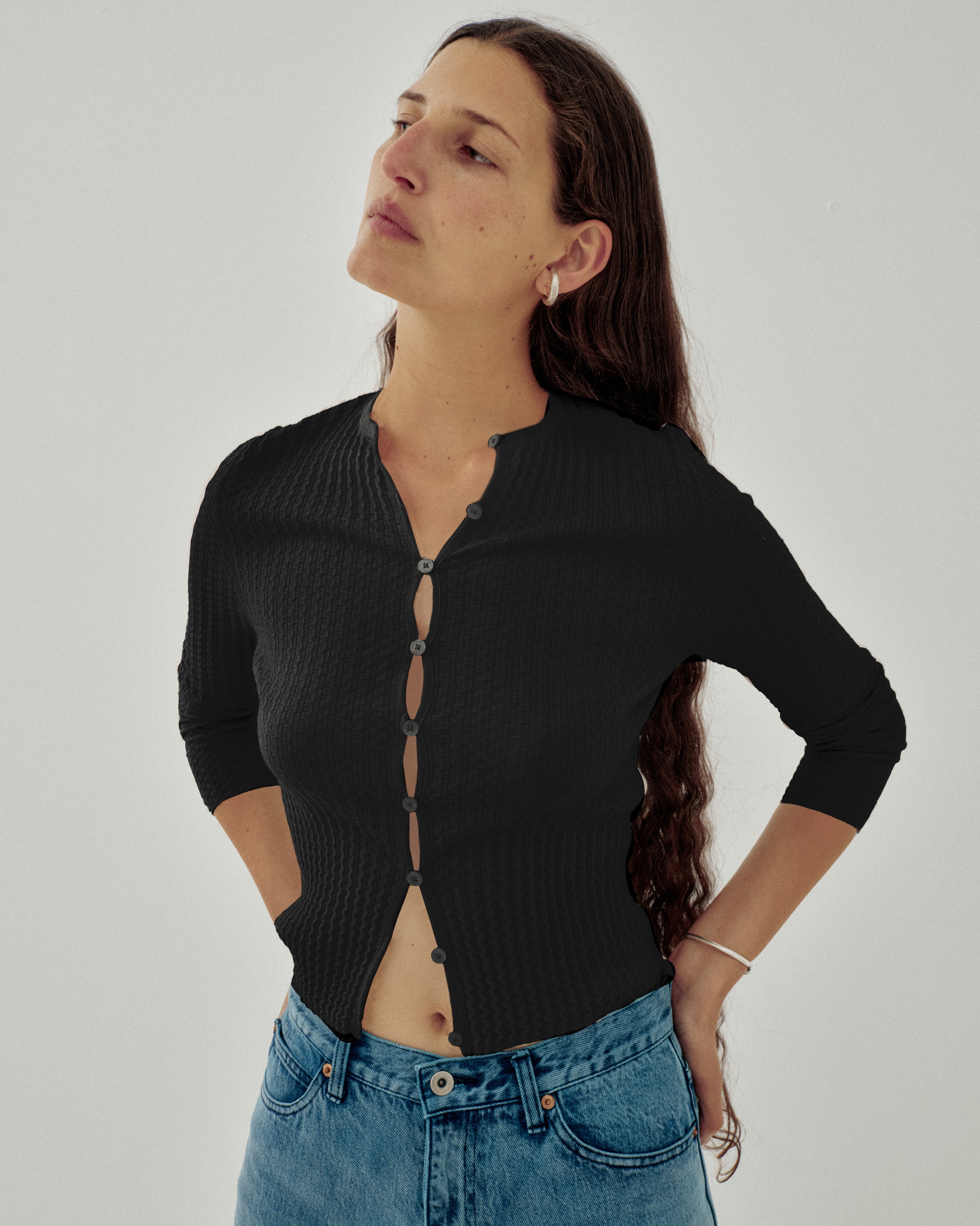 A compact cardigan in a wavy rib knit. The narrow placket with delicate buttons adds a subtle accent. Versatile in styling, it pairs effortlessly with denim for a casual look or with a skirt for a more refined feel. Simple yet distinctive, this piece brings a quiet presence to a range of styles.