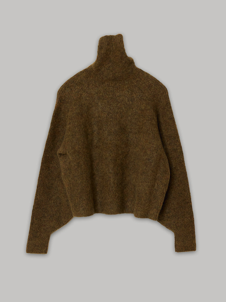 The signature high-neck from SAYAKA DAVIS’s mohair series. Featuring sculpted, curved sleeves and a generous collar as standout details. The absence of a seam at the front makes it easy to wear and reduces any tightness around the neck. The collar can be folded over or left standing, creating a balanced and versatile look. This season, the length has been shortened to provide a more modern and versatile fit, making it easier to pair with this season's bottoms.