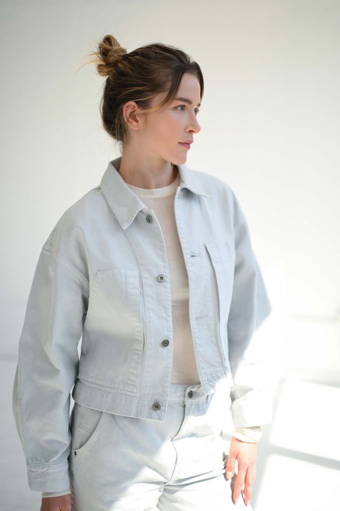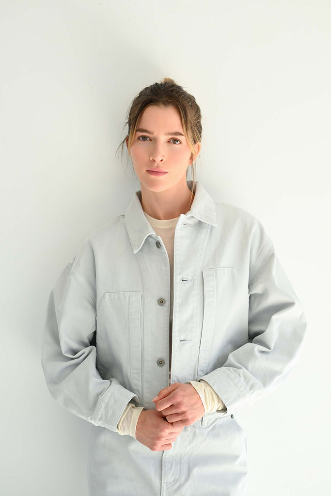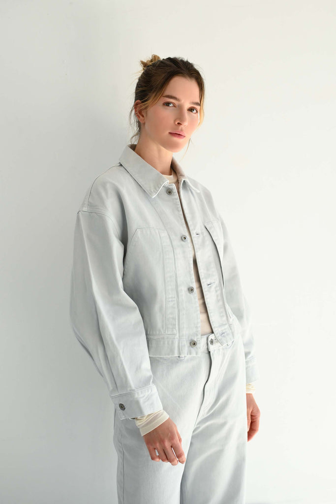 SAYAKA DAVIS cropped denim jacket with bold, oversized chest pockets as a standout detail. The roomy sleeves and cropped silhouette create a perfect balance, making it a versatile outerwear piece that pairs harmoniously with pants, skirts, dresses, and a wide range of bottoms. Made with organic cotton sourced from Turkey, it retains the classic weight of denim while offering a soft touch. The subtle Ice Gray hue blends beautifully into the autumn/winter palette as a fresh neutral color.