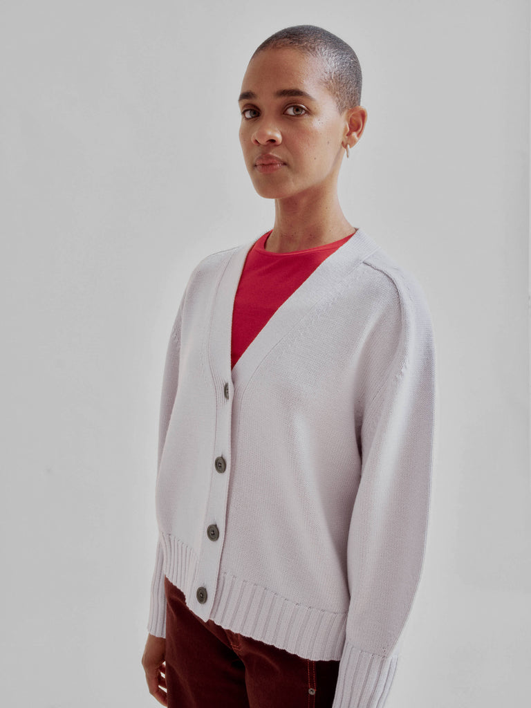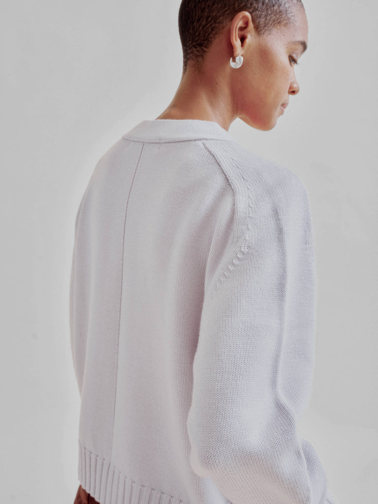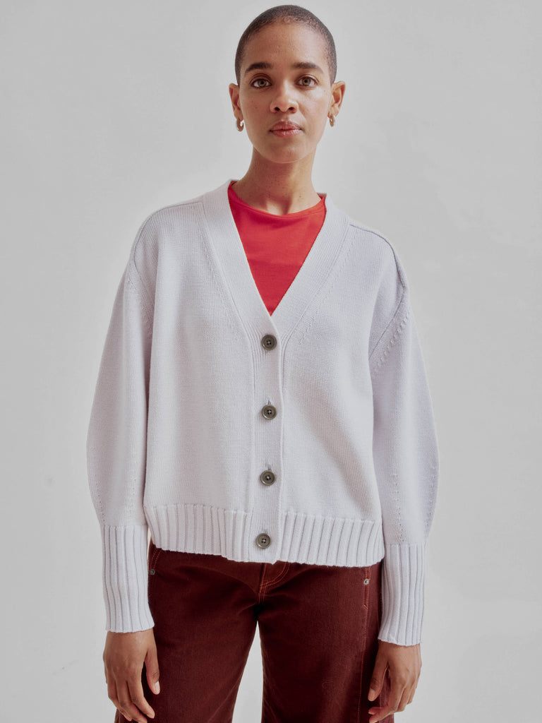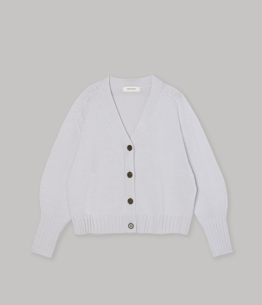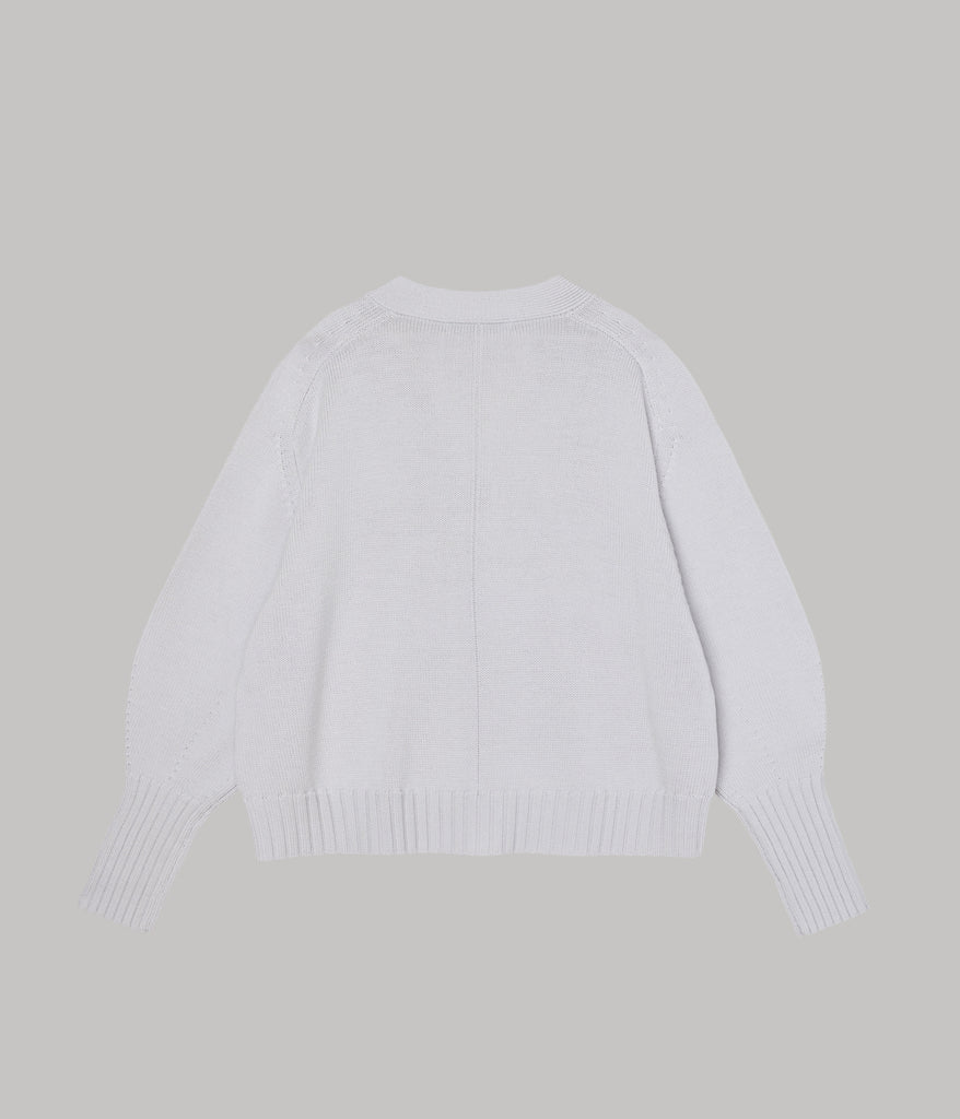 A V-neck cardigan featuring sculpted balloon sleeves and elongated cuffs. The relaxed boxy body and slightly cropped length create a balanced silhouette that pairs effortlessly with midi skirts, straight-leg, and barrel-leg trousers.