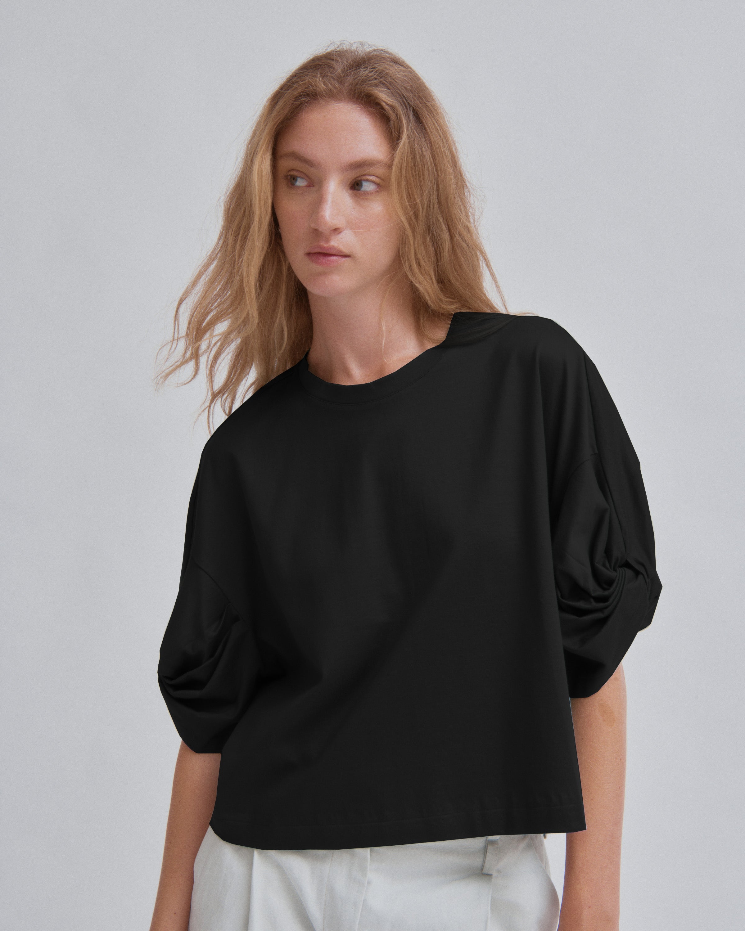 SAYAKA DAVISのセグニチャー、ツイストスリーブTシャツ。クロップド丈とボックスシルエットのボディに、ねじったスリーブをアクセントにした一枚。カジュアルでラフなスタイリングにも個性をプラスし、どんなシルエットのパンツやスカートとも自在にスタイリングを楽しめる万能な定番アイテム。