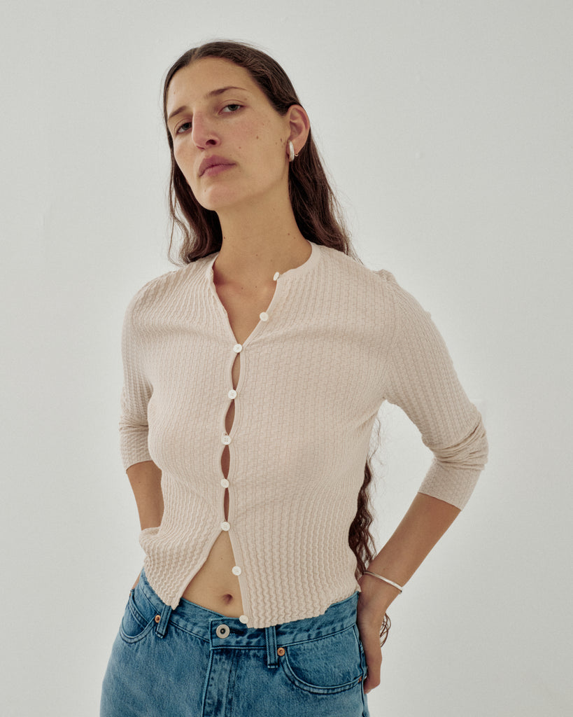 Wavy Rib Knit Cardigan in Light Beige Organic Cotton, Regular Fit