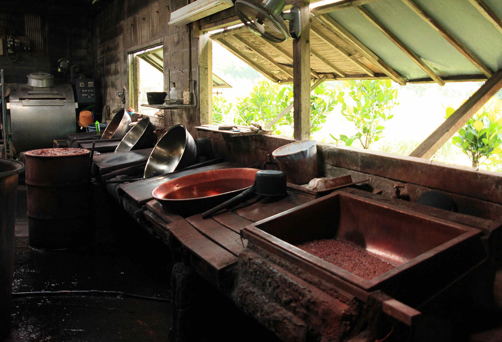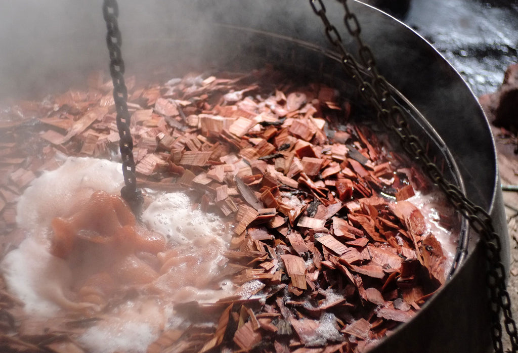 地元ではテーチと呼ばれる車輪梅をチップにし、煮出すこと14~16時間。煮出し終えたチップは次回の燃料に、木灰は藍染や陶芸などに再利用されているそう。