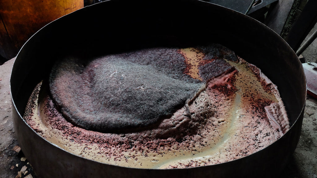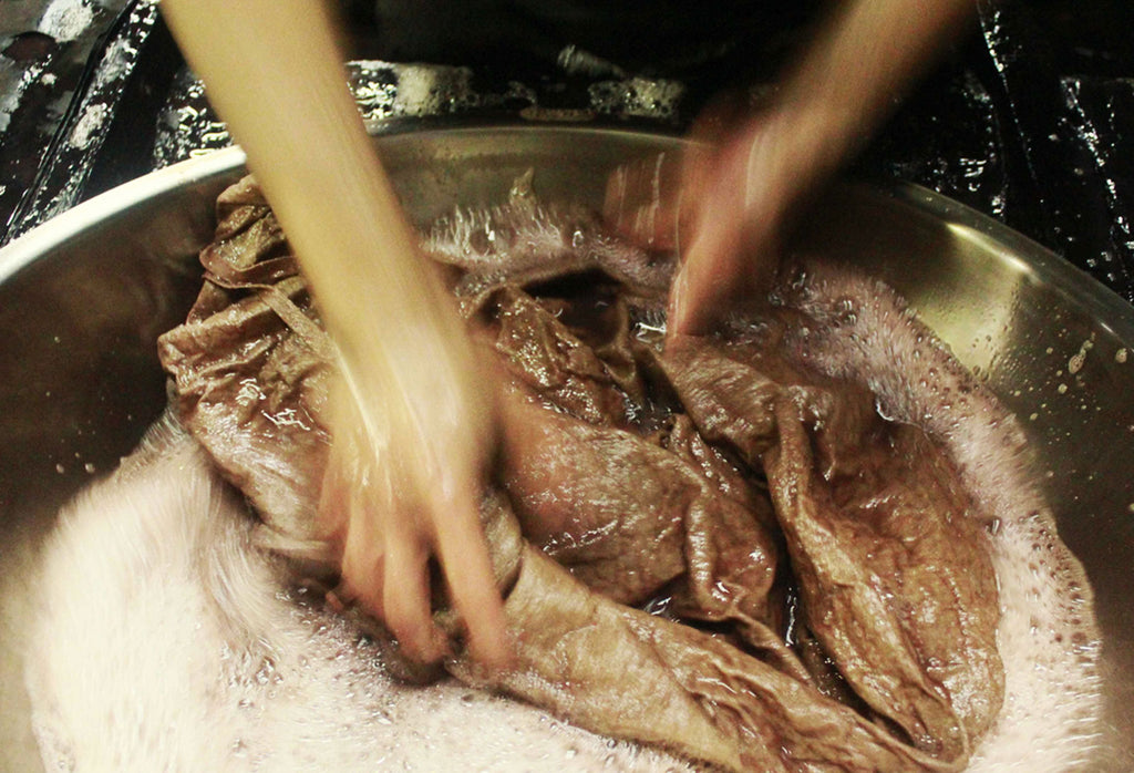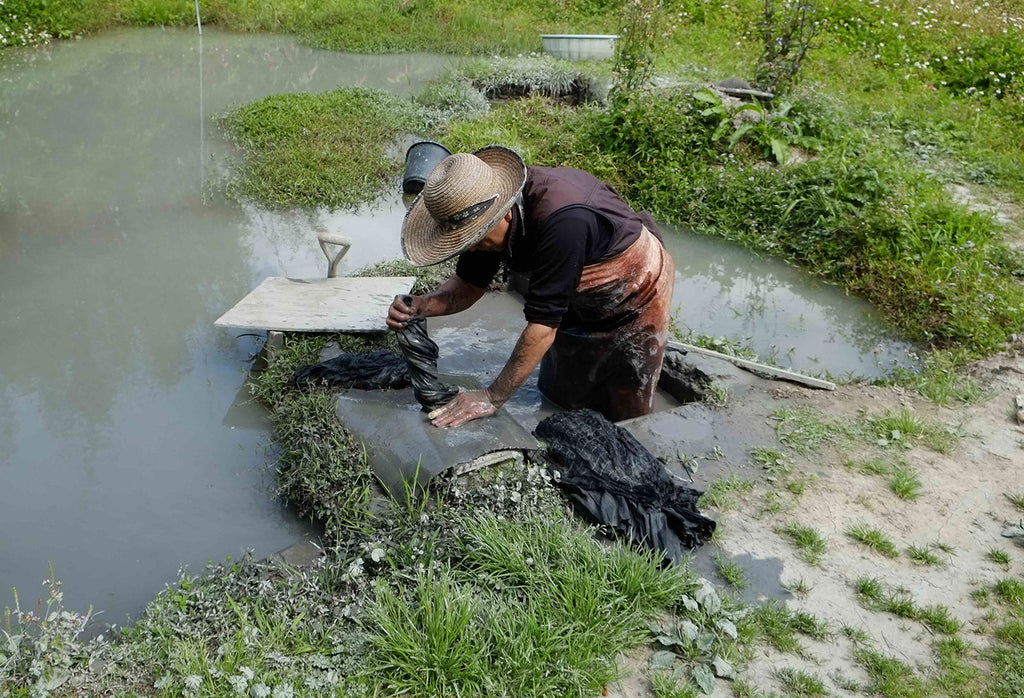 煮出して抽出された染料に浸し、素手で揉み込みながら何度も染め重ねることで、深く濃く、色を重ねていきます。
