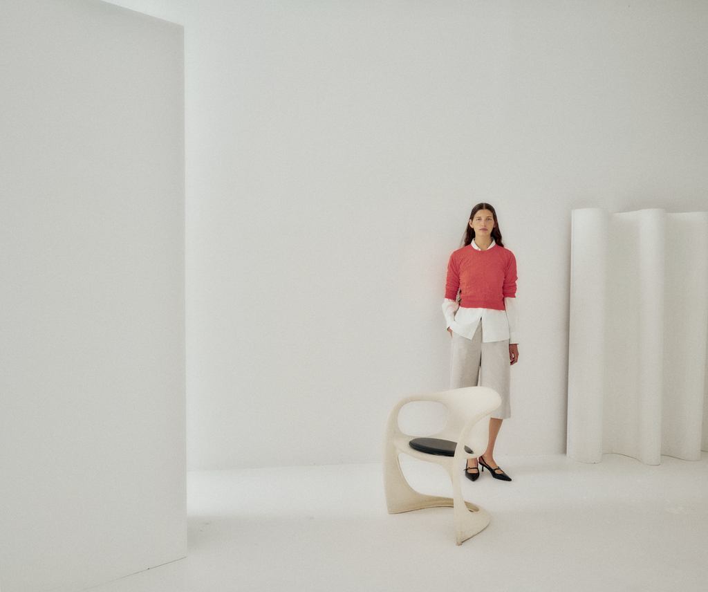 Crinkled Pullover in Poppy Red, Slim Shirt in Mint Organic Cotton Poplin,