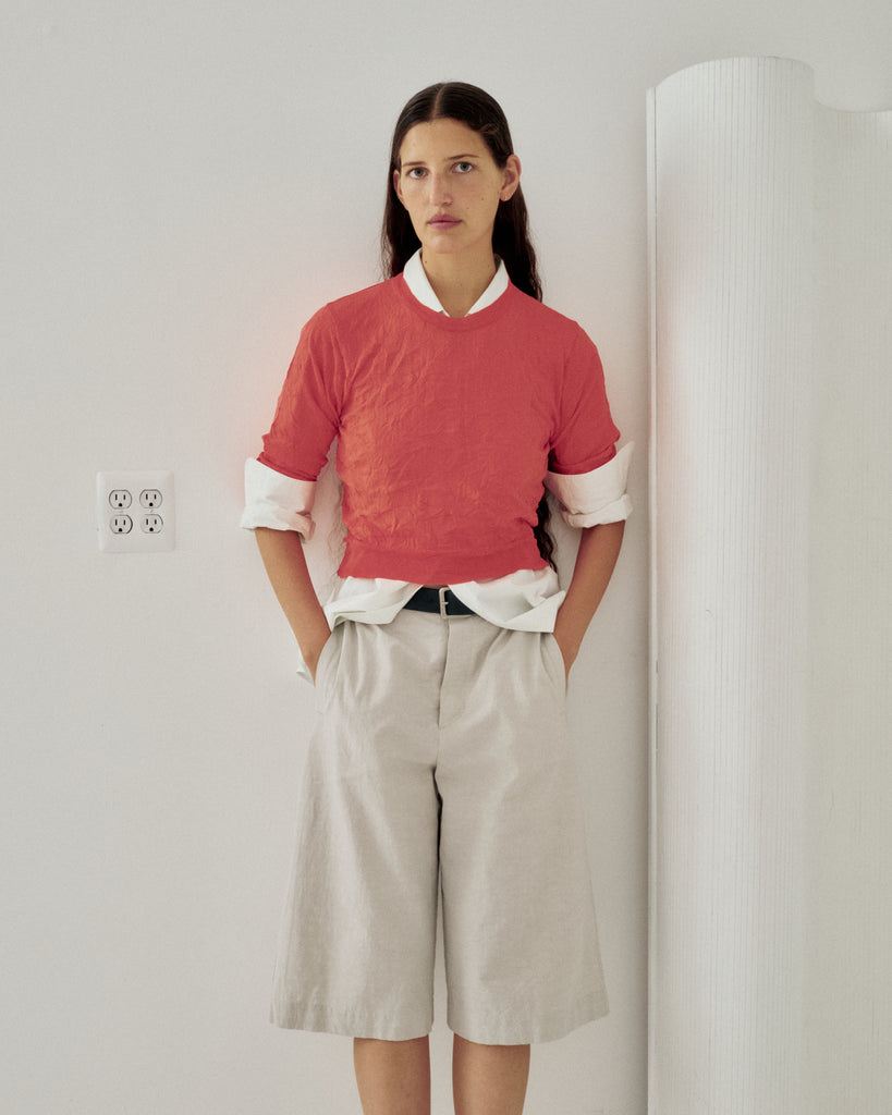 Crinkled Pullover in Steel, Crinkled Knit Skirt in Poppy Red, Inner: