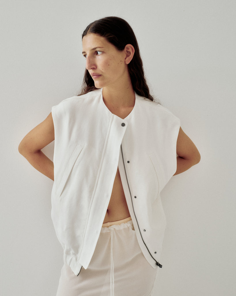 Bomber Vest White Lyocell Double Cloth, Silk Chiffon Skirt in White