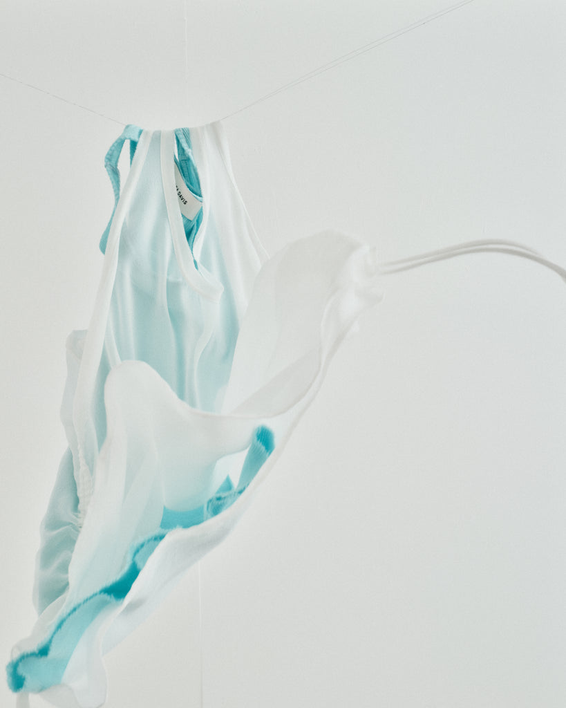 Silk Chiffon Tank in White, Sheer Rib Tank in Cyan