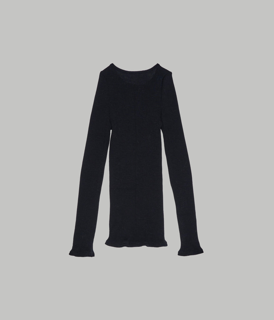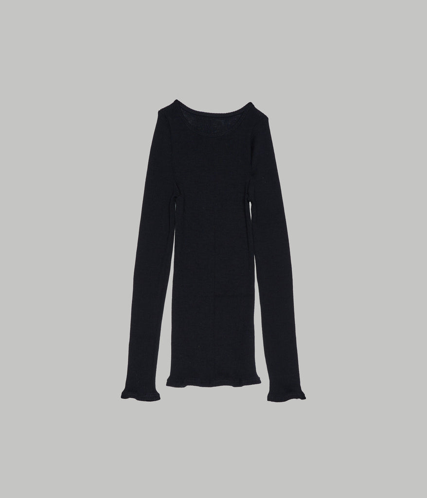 A seamless rib crewneck with a meltingly soft hand feel. Designed as a washable, 100% natural fiber innerwear series, it is crafted from premium Super 120’s merino wool and slowly knit into a seamless tubular form using rare German Albi knitting machines found only in Japan. The fiber’s air-trapping structure provides excellent warmth and natural temperature regulation for year-round comfort, while its inherent deodorizing properties make it ideal for innerwear. With outstanding stretch and recovery, it conforms comfortably to the body without constriction, and pairs beautifully layered with the matching crewneck or turtleneck styles.