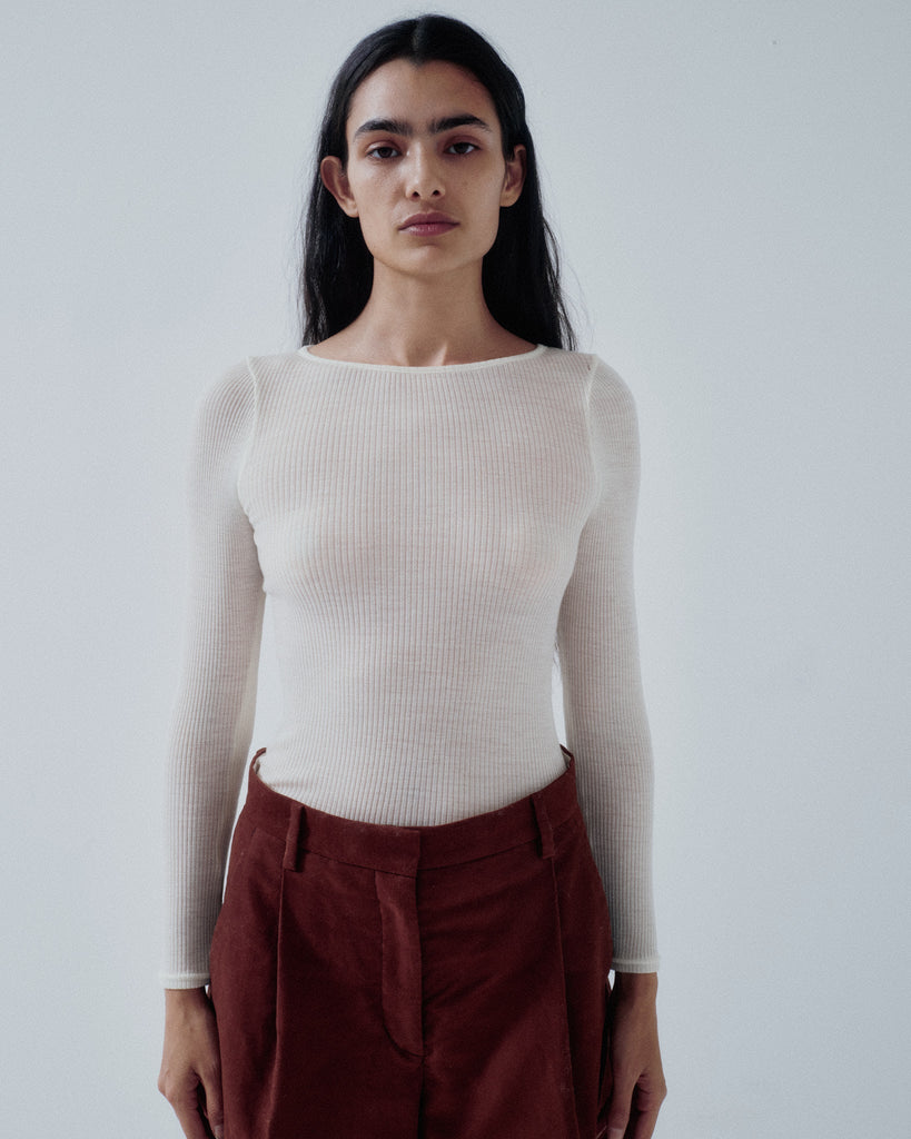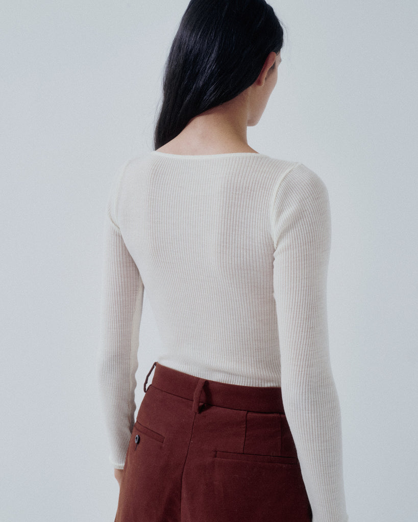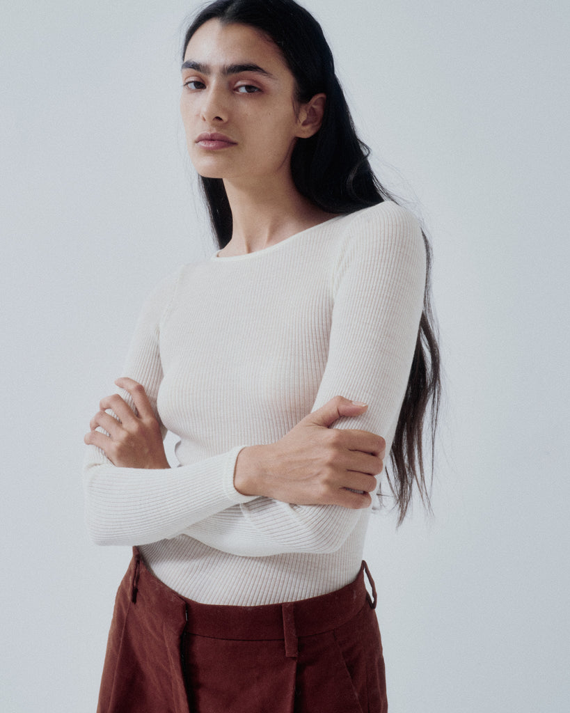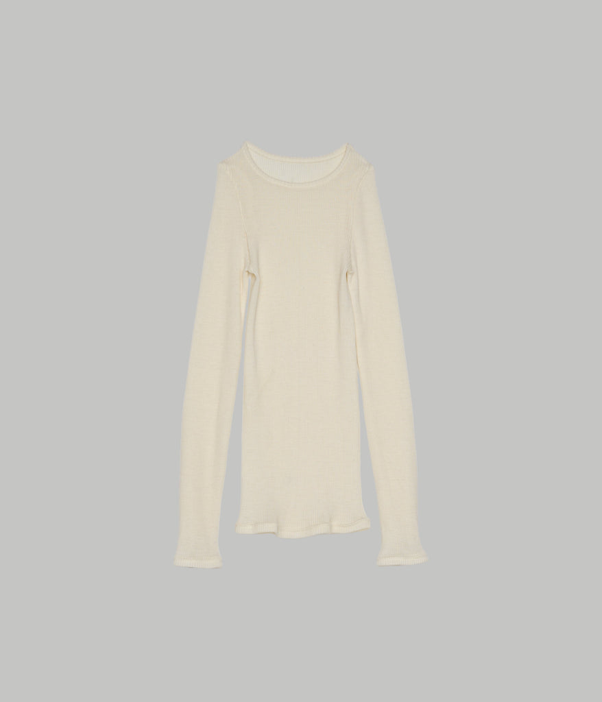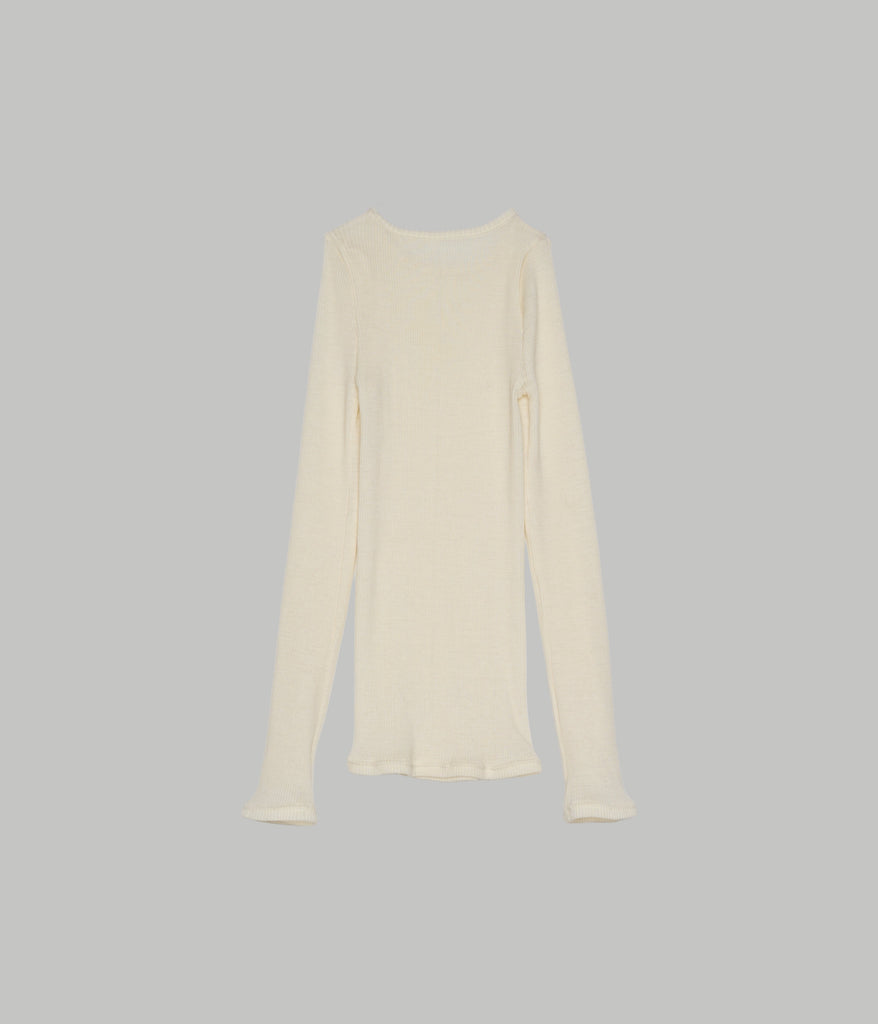 A seamless rib crewneck with a meltingly soft hand feel. Designed as a washable, 100% natural fiber innerwear series, it is crafted from premium Super 120’s merino wool and slowly knit into a seamless tubular form using rare German Albi knitting machines found only in Japan. The fiber’s air-trapping structure provides excellent warmth and natural temperature regulation for year-round comfort, while its inherent deodorizing properties make it ideal for innerwear. With outstanding stretch and recovery, it conforms comfortably to the body without constriction, and pairs beautifully layered with the matching crewneck or turtleneck styles.