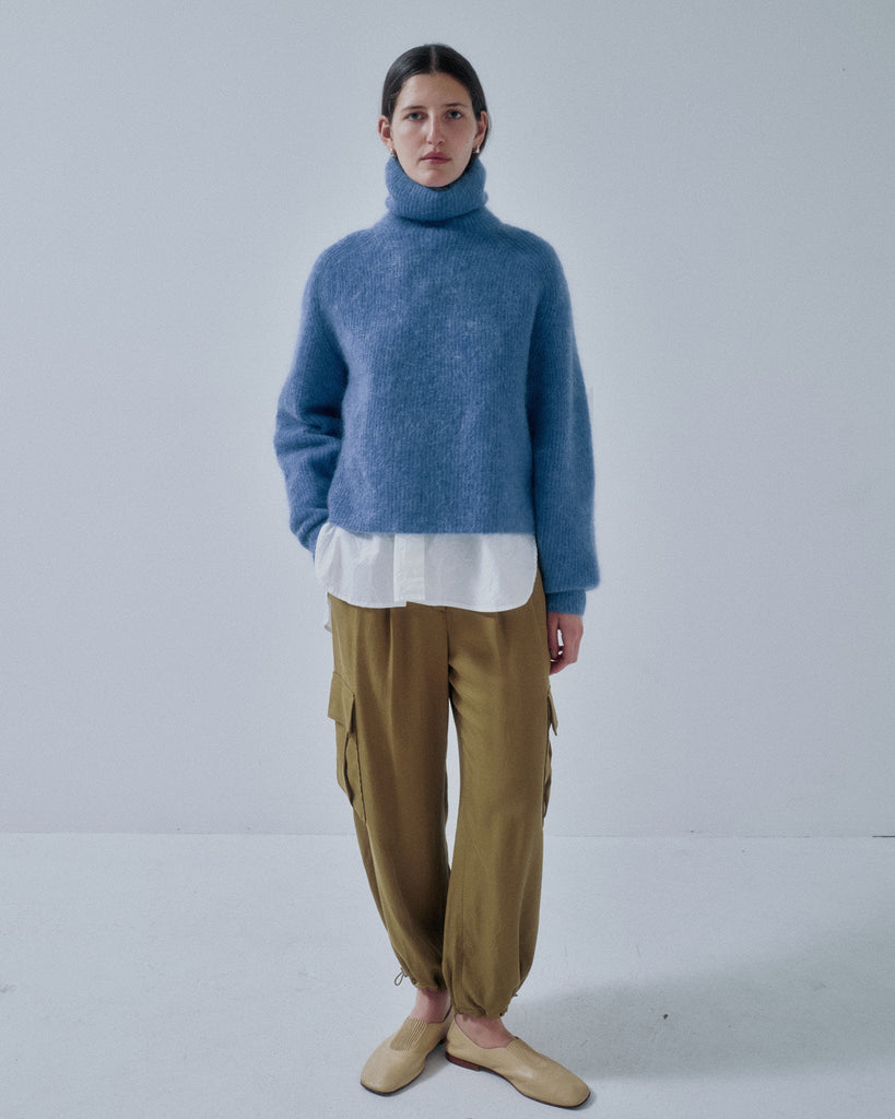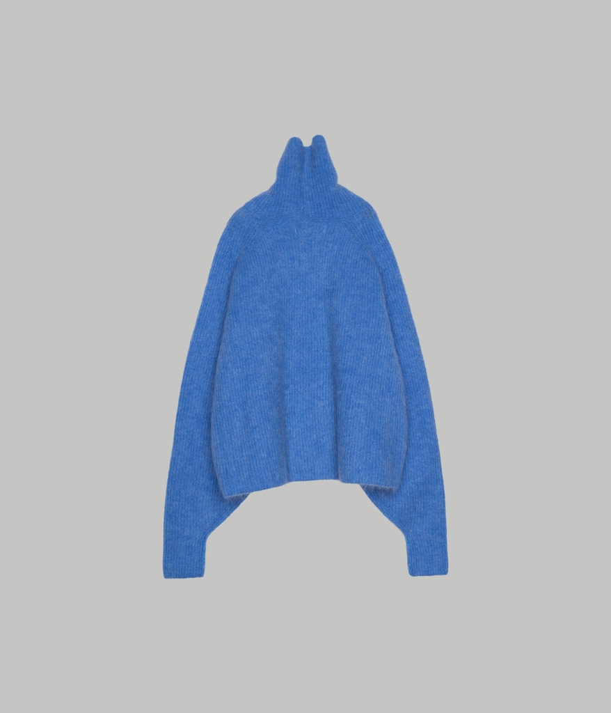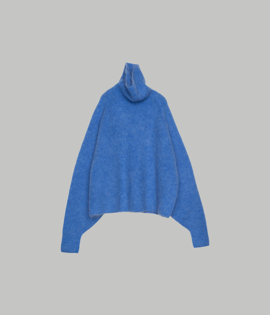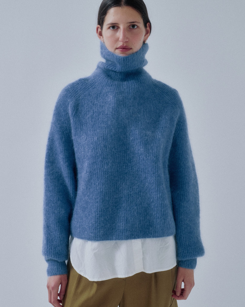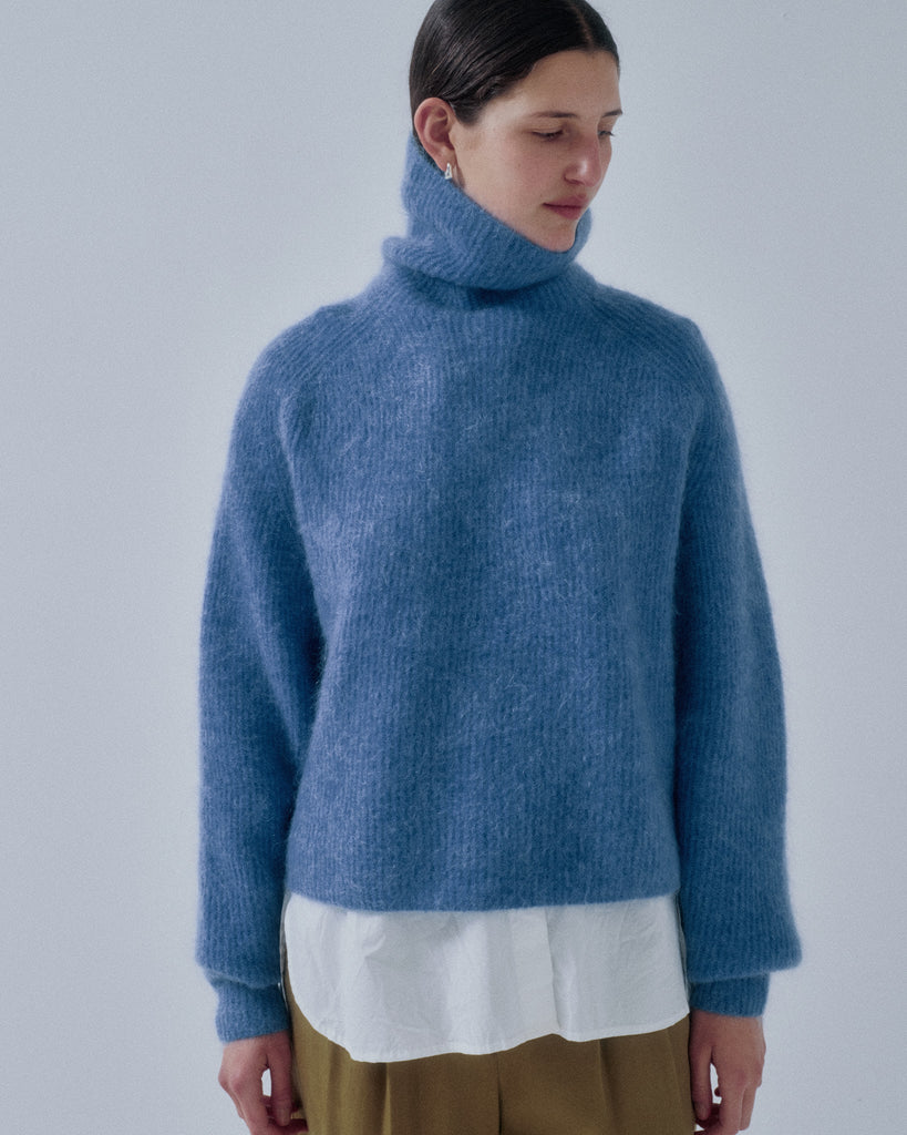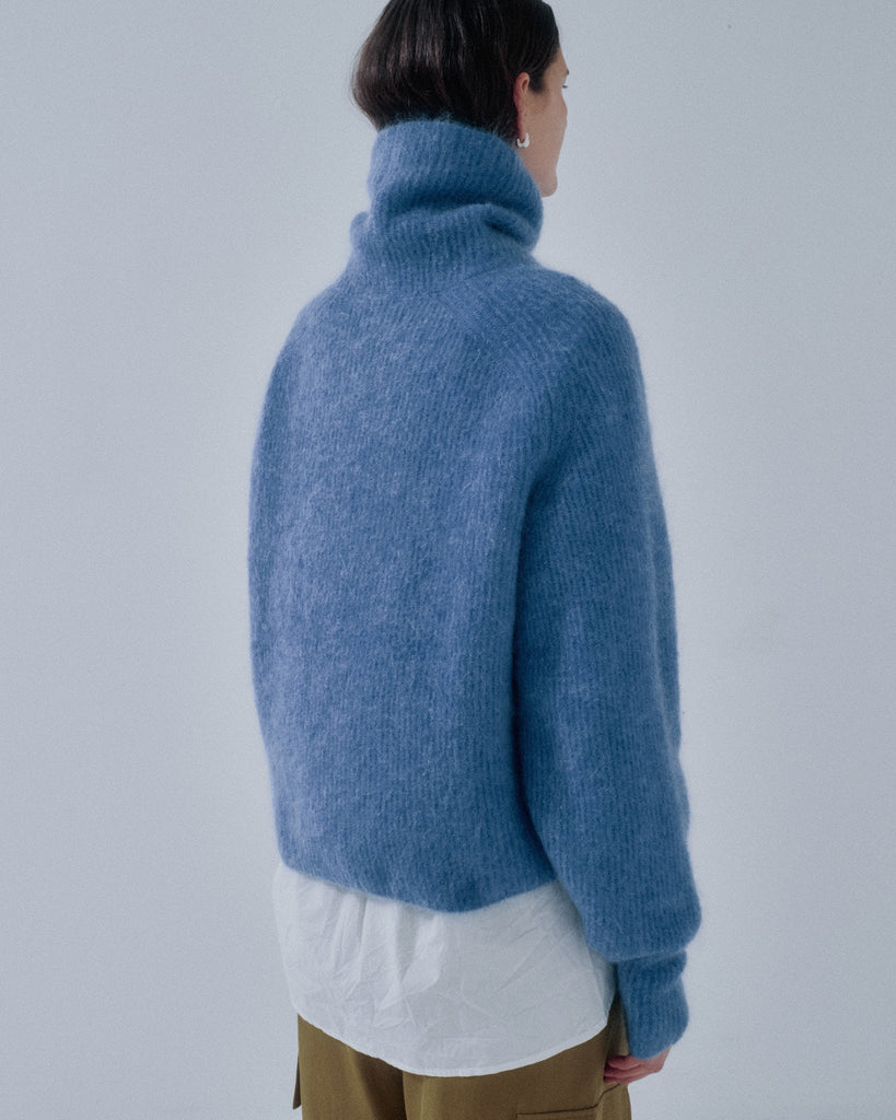 The signature high-neck from SAYAKA DAVIS’s mohair series. Featuring sculpted, curved sleeves and a generous collar as standout details. The absence of a seam at the front makes it easy to wear and reduces any tightness around the neck. The collar can be folded over or left standing, creating a balanced and versatile look. This season, the length has been shortened to provide a more modern and versatile fit, making it easier to pair with this season's bottoms.